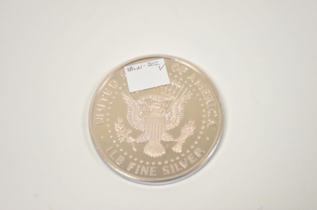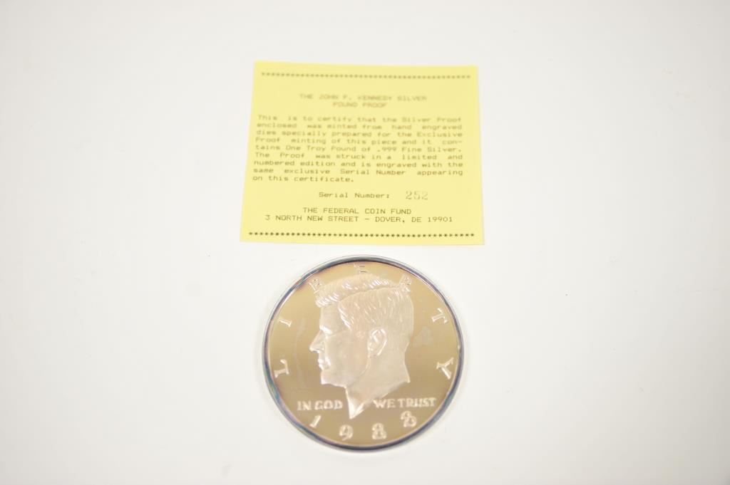 Federal Coin Fund 1988 John F. Kennedy Silver Pound Proof coin in plastic holder and two piece cardboard box/Certificate of Authenticity. Est.: $225-$275.