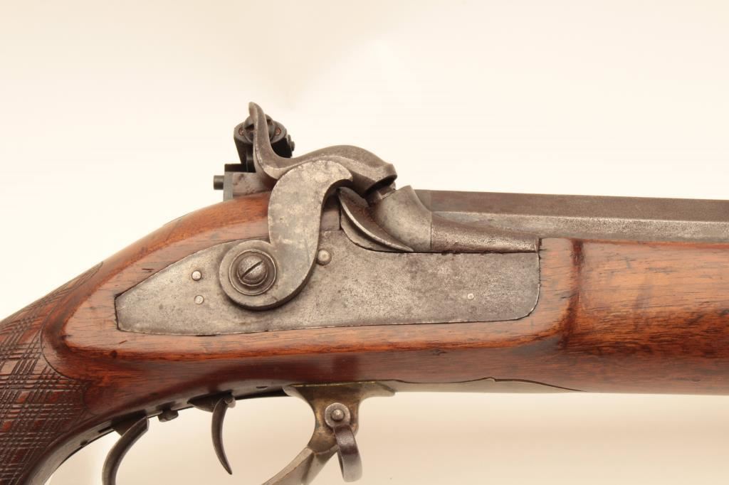 Heavy barrel European percussion target rifle, approximately .70 caliber, double set triggers (working at time of description), 37” octagon barrel, brown patina to metal surfaces, brass mounts and butt plate, modern Lyman adjustable rear tang sight and modern hooded front sight; overall good condition; good action, undecipherable proof at breech on top flat of barrel, full length checkered wood stock has 3 barrel retaining keys and is good overall. (Antique). Est.: $800-$1,600.
