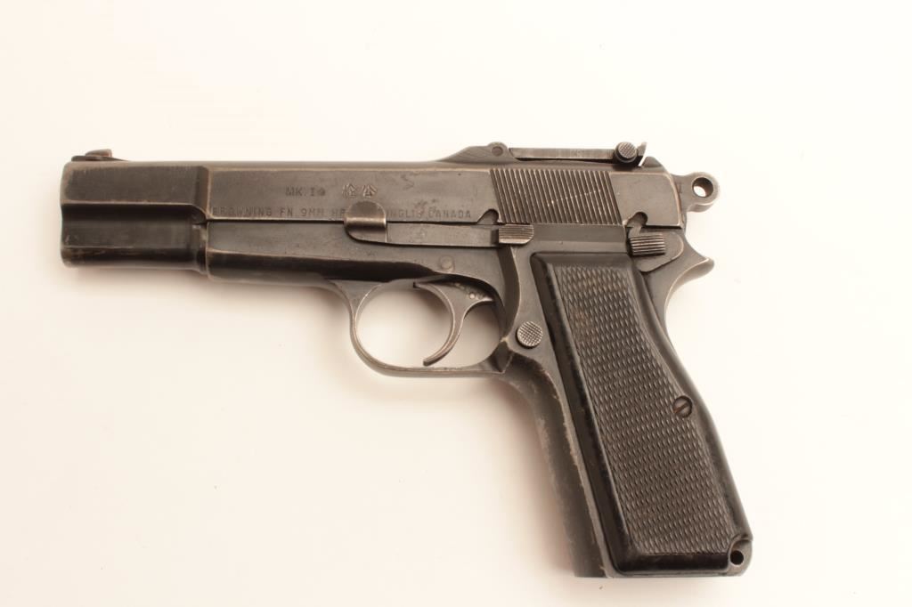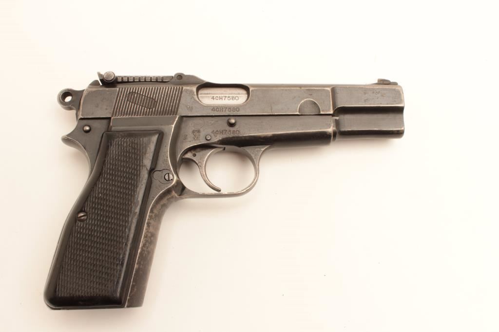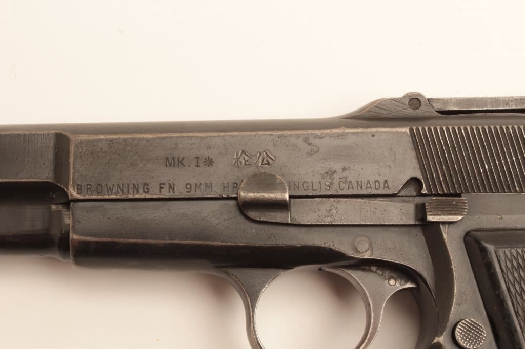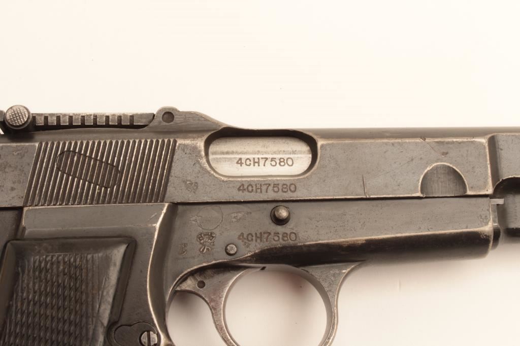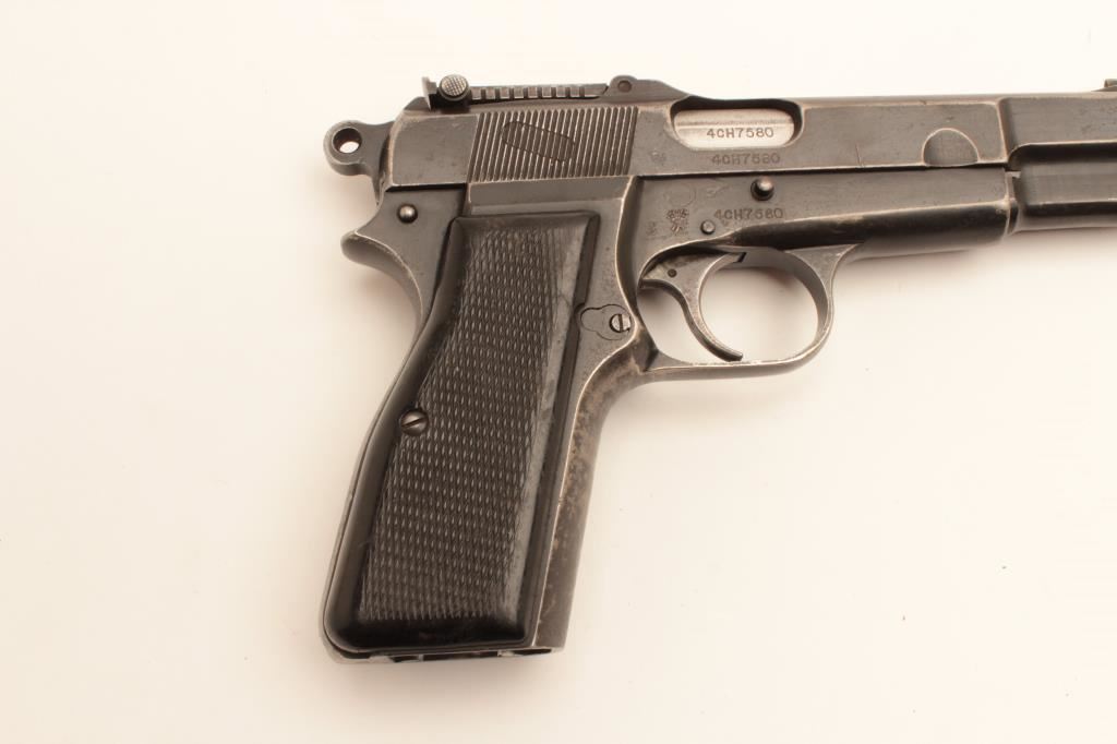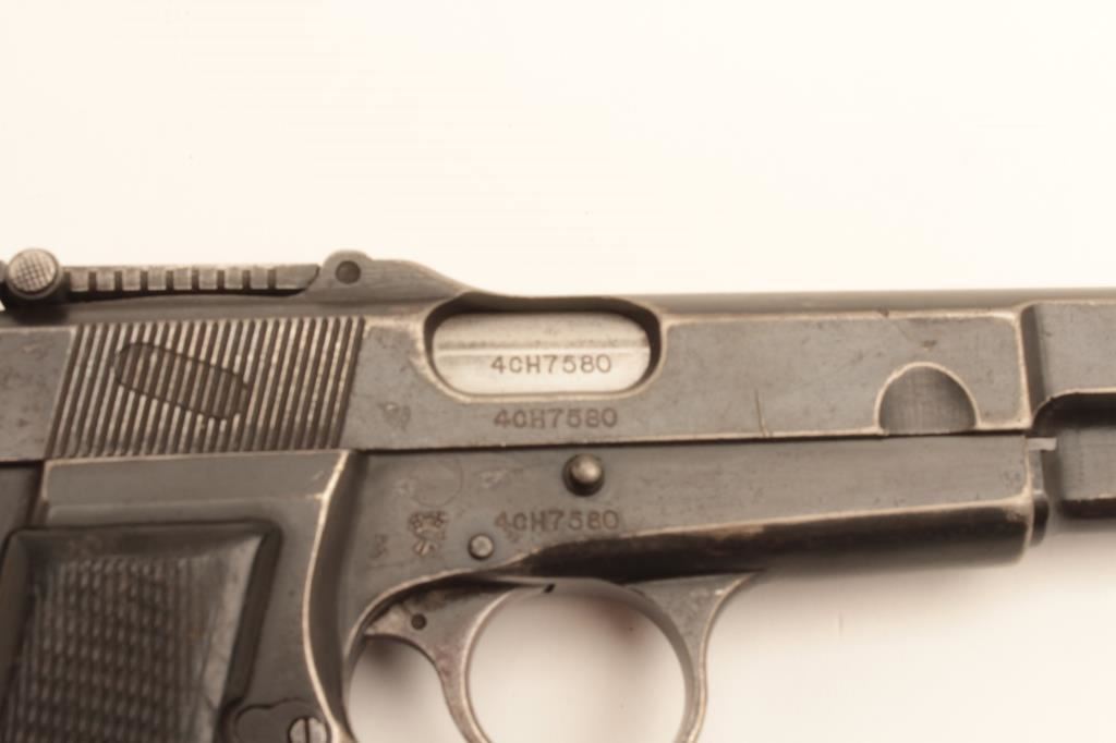 Browning Inglis MK I semi-automatic pistol, no magazine, 9mm caliber, 4.75” barrel, tangent sight, cut for shoulder stock, blued finish, checkered black grips, S/N 4CH7580; overall good to very good condition with majority of finish remaining; very good bore, crisp action, very good markings and good + grips. (C&R/PPT). Est.: $600-$1,200.