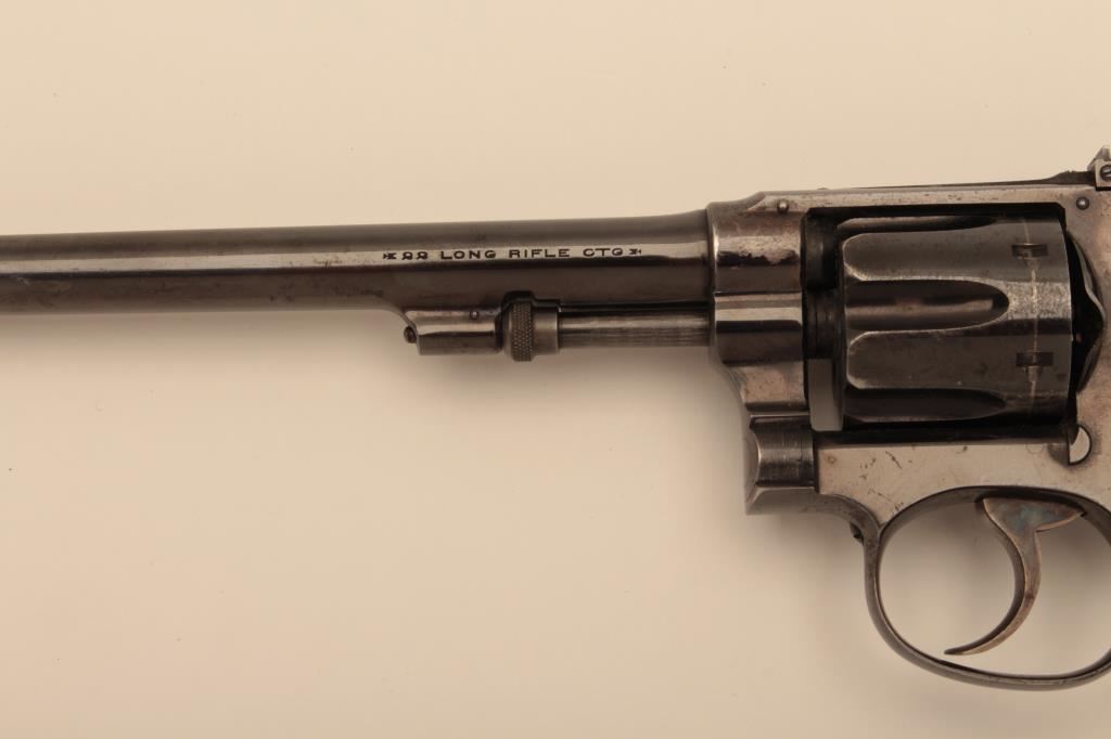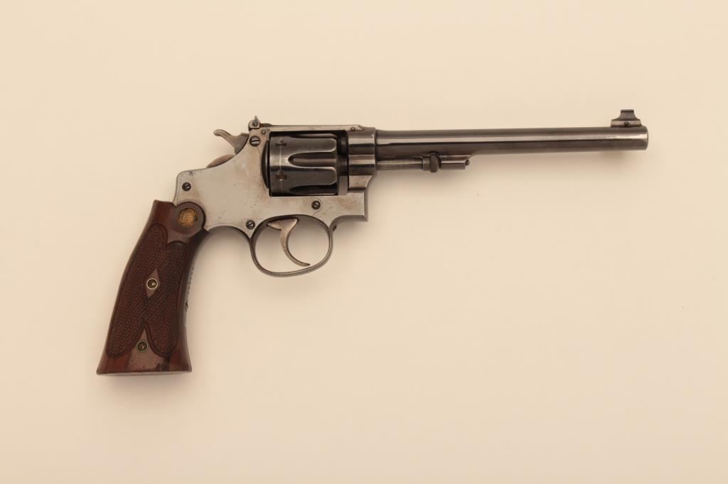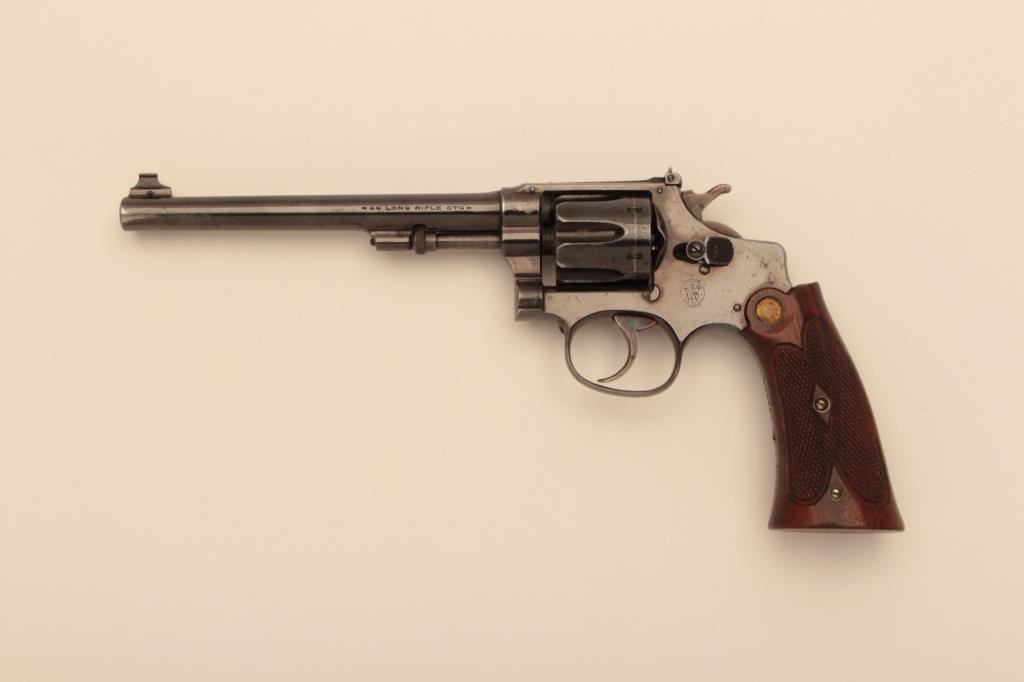 Smith & Wesson Bekeart-style 5 screw hand ejector DA target revolver, .22LR caliber, 6” barrel, blued finish, checkered target extended wood gold medallion grips, S/N 163198; overall fine condition showing majority of original finish, some holster wear and minor spots of flaking to finish, fine bore, action, markings and grips. (C&R/NO PPT). Est.: $500-$1,000.