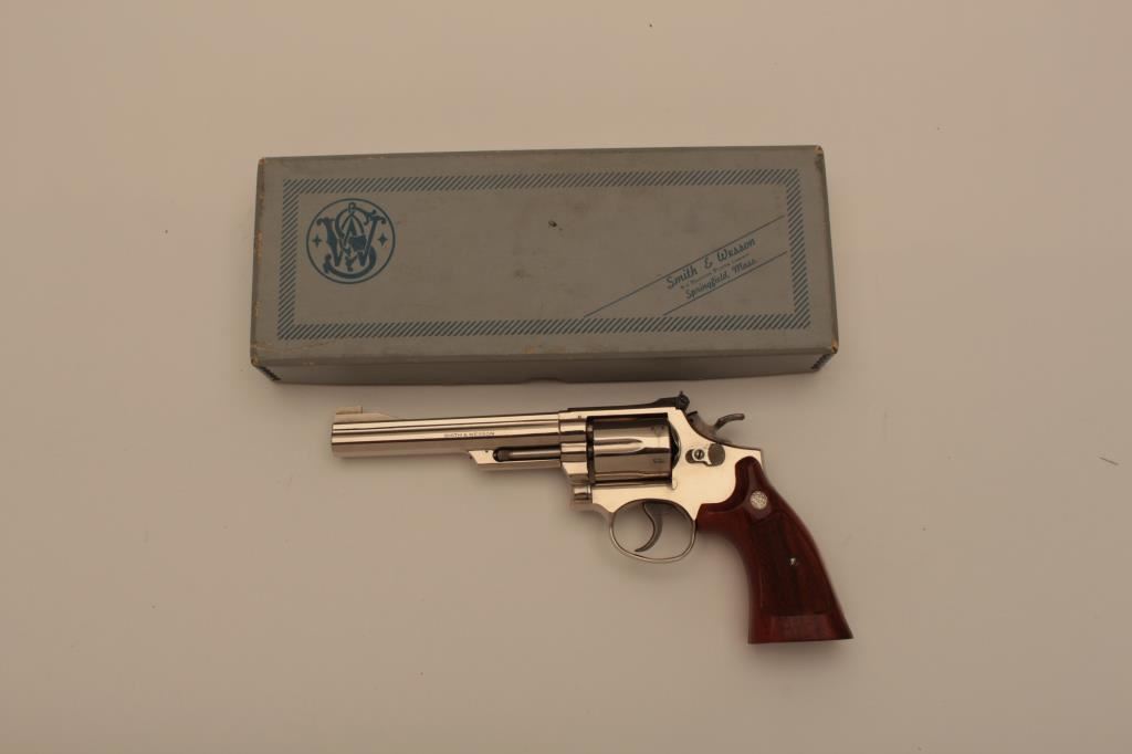 Smith & Wesson Model 19-3 DA revolver, .357 Magnum caliber, 6” barrel, nickel finish, checkered wood medallion combat grips, S/N 4K45994; overall excellent condition showing minimal use or handling; accompanied by factory two piece silver and blue cardboard box. (Modern/NO CAL. SALE). Est.: $500-$1,000.