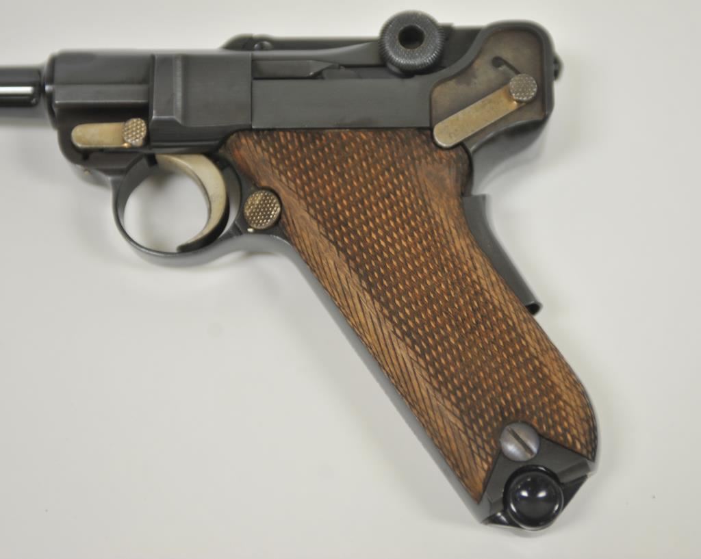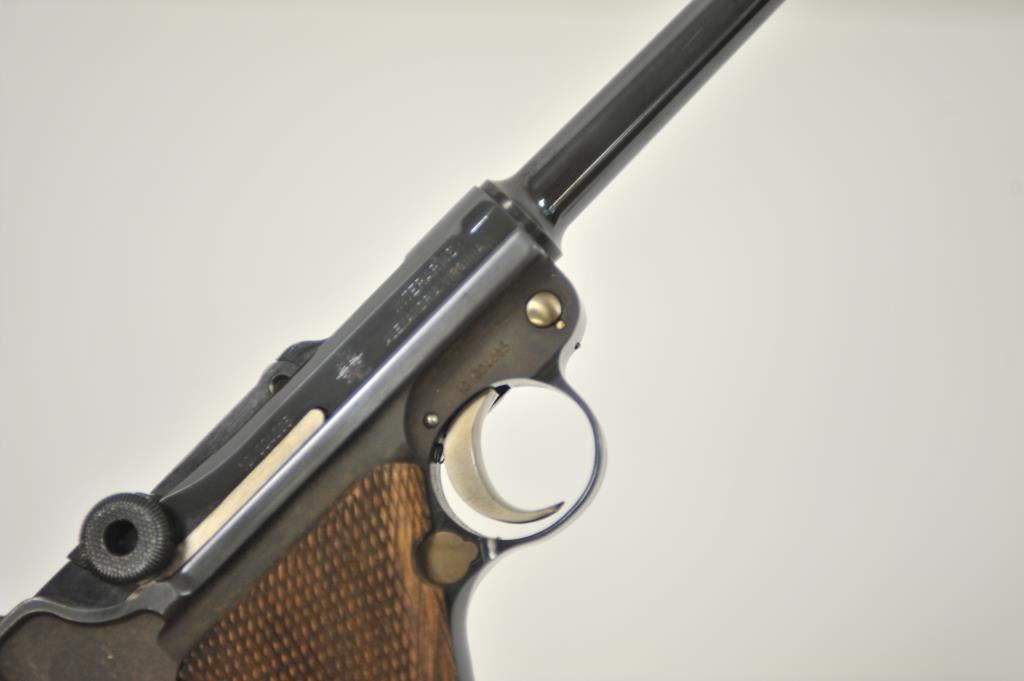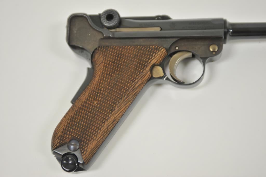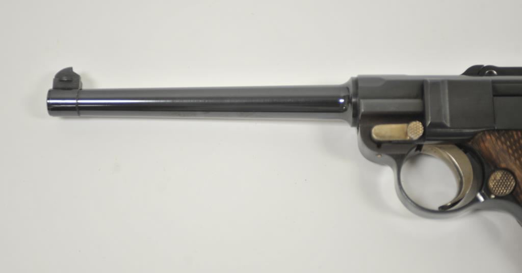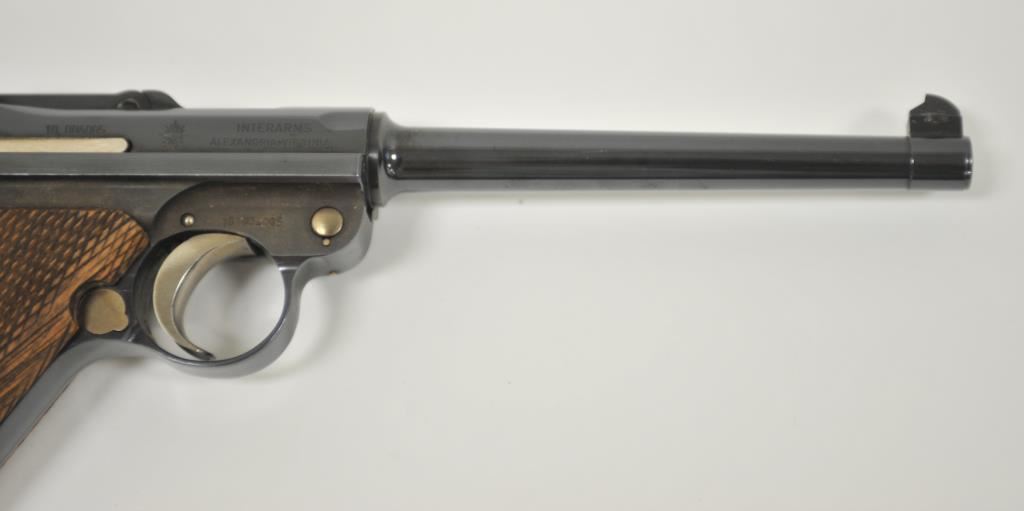 Mauser Oberndorf American Eagle by Interarms semi-automatic pistol, .30 Luger caliber, 6” barrel, blued finish, checkered wood grips, S/N 10.004005; overall fine used condition with fine bore, action, markings and grips; majority of original finish remaining. (Modern/PPT). Est.: $700-$1,400.