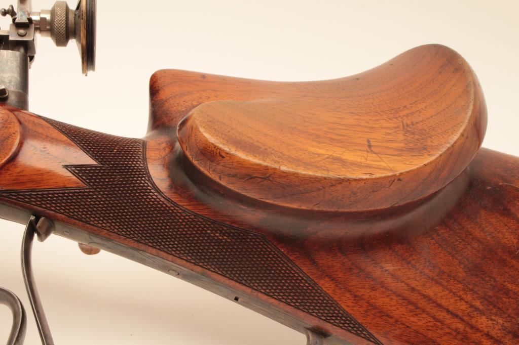 High Grade German Schuetzen target rifle, AUDT falling block action, engraved receiver with two panel scenes, blued and case hardened finish, target sights present, double set triggers (working at time of description), checkered finely grained Schuetzen butt stock and iron butt plate, 8.15 x 46 caliber, 32” octagon barrel, S/N 687; overall very good to fine condition with a fine bore, crisp action, sharp engraving and markings, very good + wood stocks. (Antique). Est.: $1,750-$3,500.