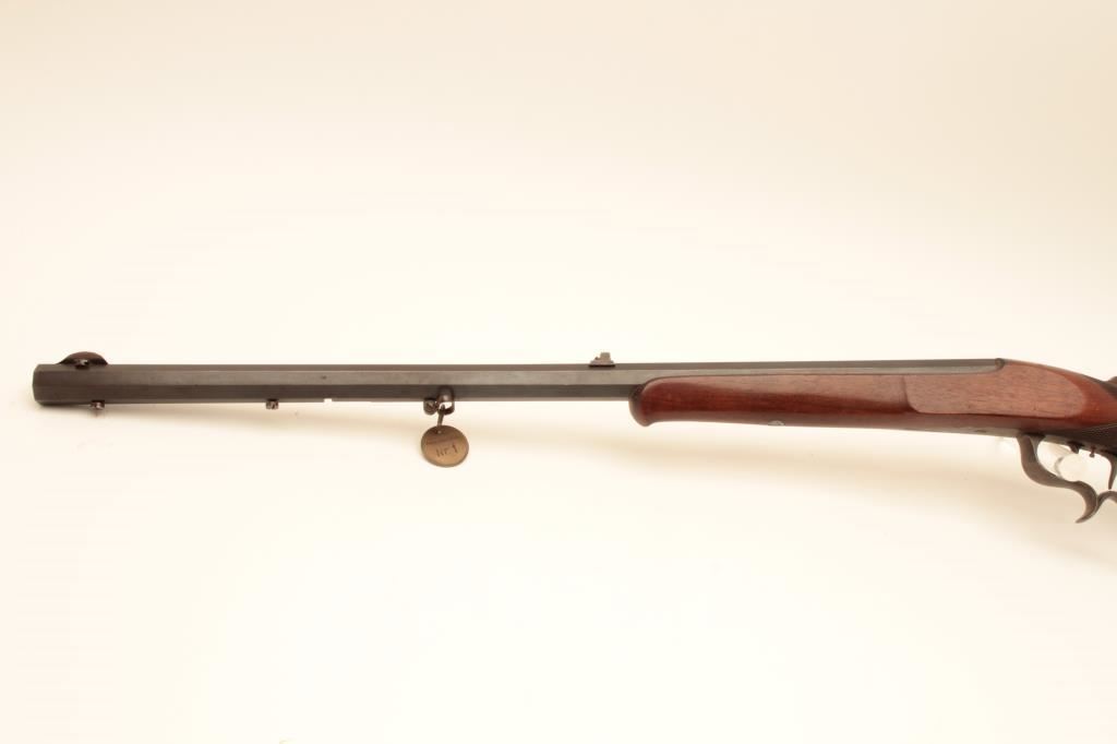 European Zimmer Schuetzen rifle, .17 caliber, double set triggers (working at time of description), blued and case hardened finish, checkered wood stock with Schuetzen butt plate; overall very good condition with majority of blued finish remaining on barrel and toning of case colors on lever and butt plate. (Antique). Est.: $300-$600.