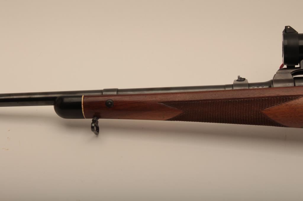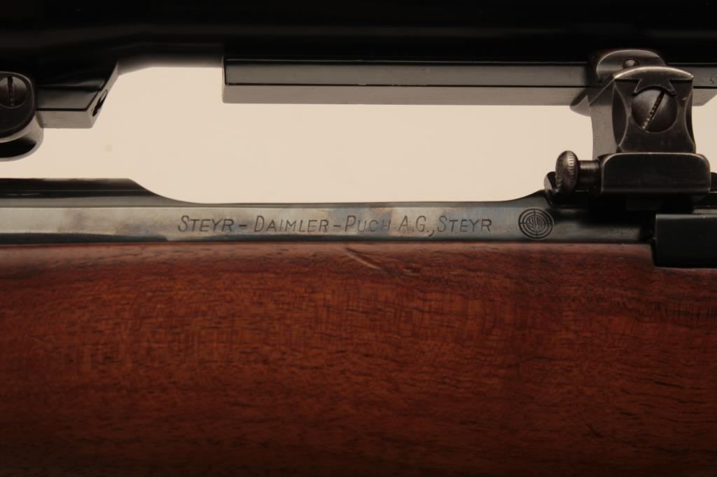 Steyr-Mannlicher Model 1952 bolt action rifle, .30-06 caliber, 24” barrel, blued finish, checkered wood stock, double set triggers (working at time of description), sling swivels, Decelerator hard rubber butt pad, Q. D. Mounts for German Hensoldt Dital 4x32 scope displaying fine optics, S/N 19943; overall very good to fine condition with majority of blued finish remaining, very good to fine bore, crisp action, sharp markings and fine stock. (C&R/PPT). Est.: $900-$1,800.