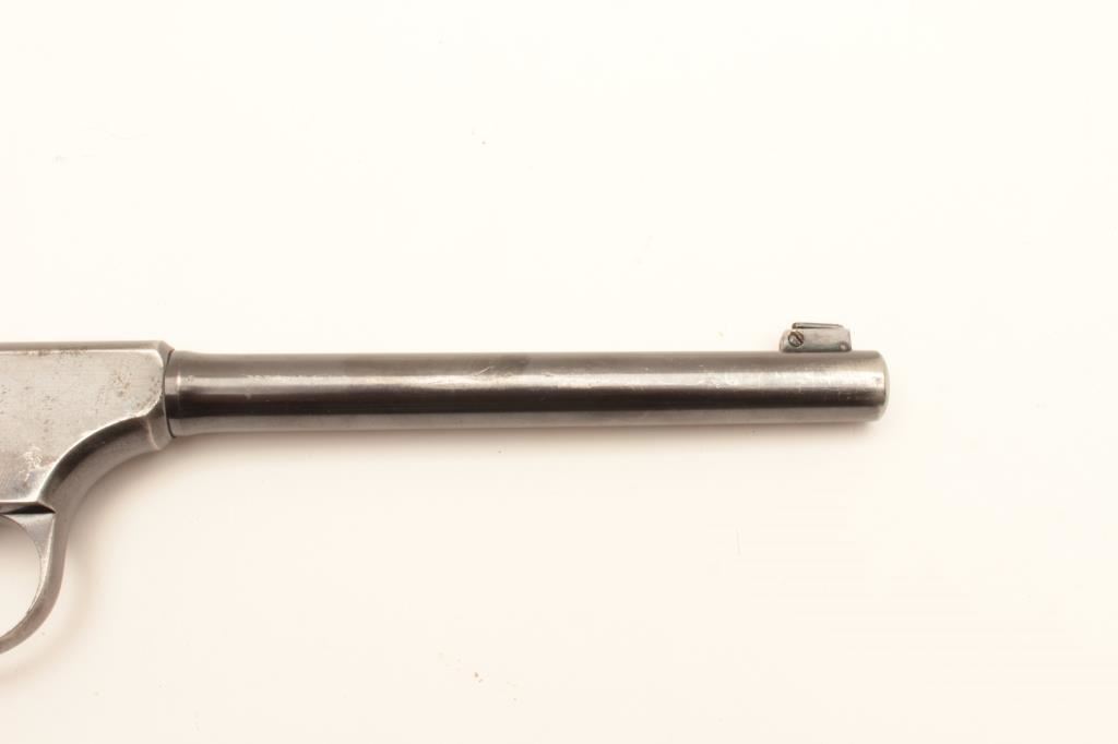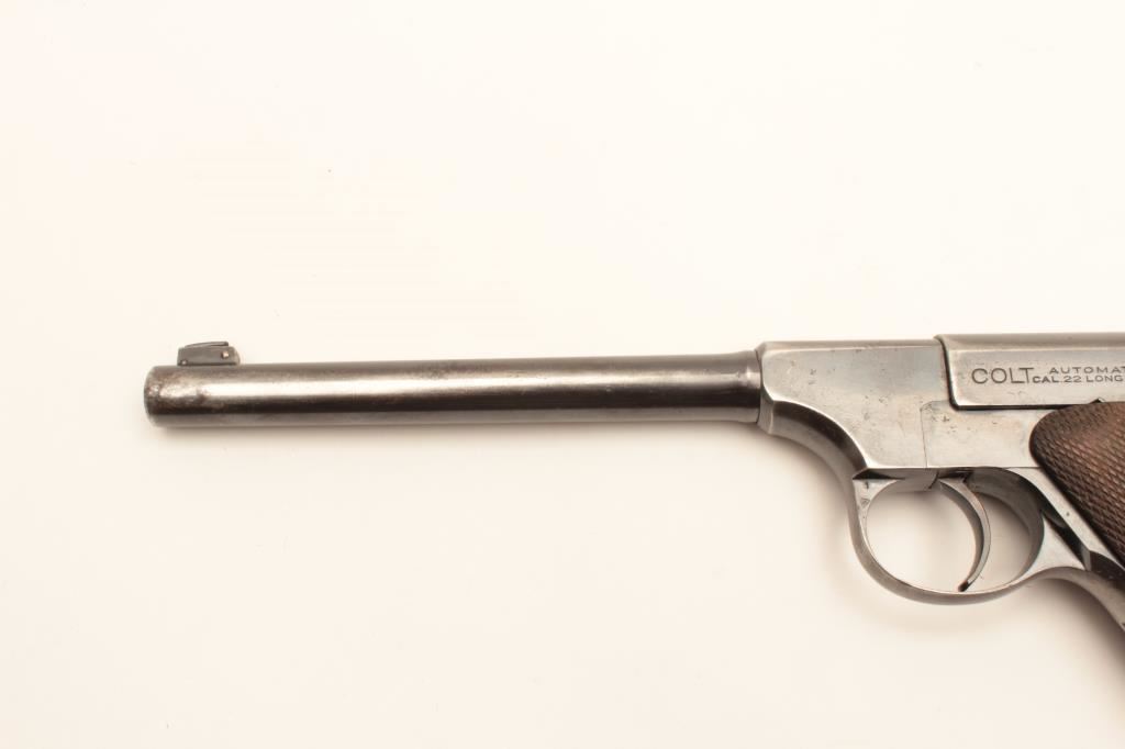 Colt Woodsman semi-automatic pistol, .22LR caliber, 6.5” barrel, blued finish, checkered wood grips, two tone magazine, S/N 53064; considerable original blued finish on frame with holster wear to barrel; good bore, crisp action and markings, wood grips show wear but are good with an old circular black stain on the right grip top and old loss to the bottom of that grip. (C&R/PPT). Est.: $300-$600.