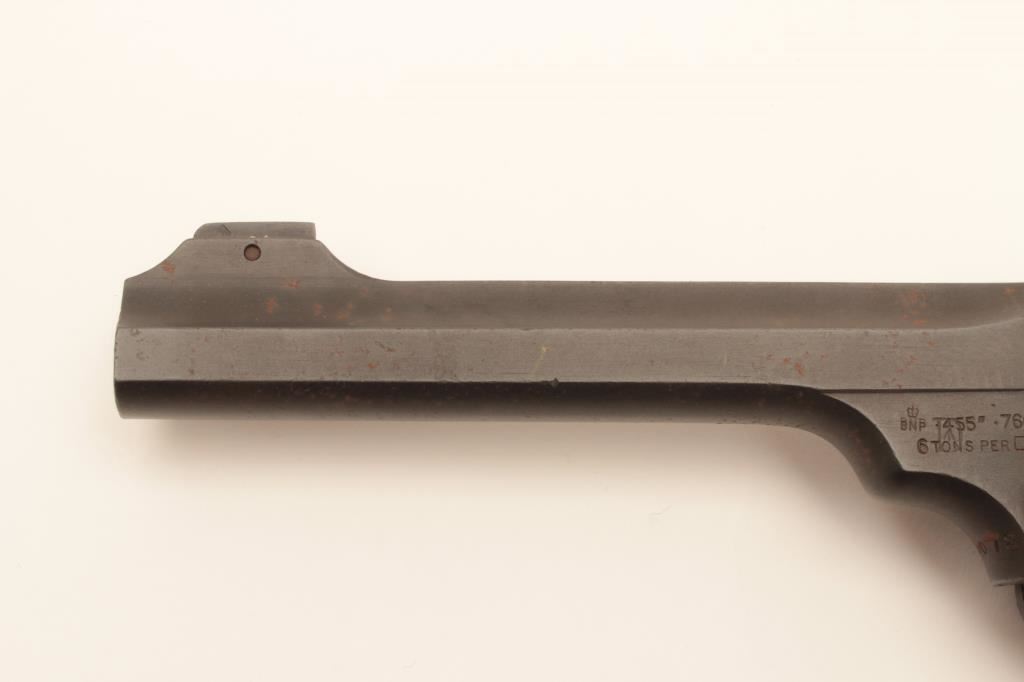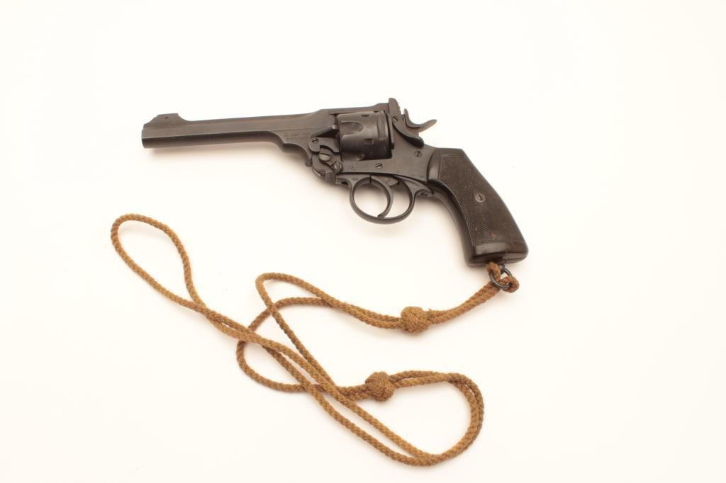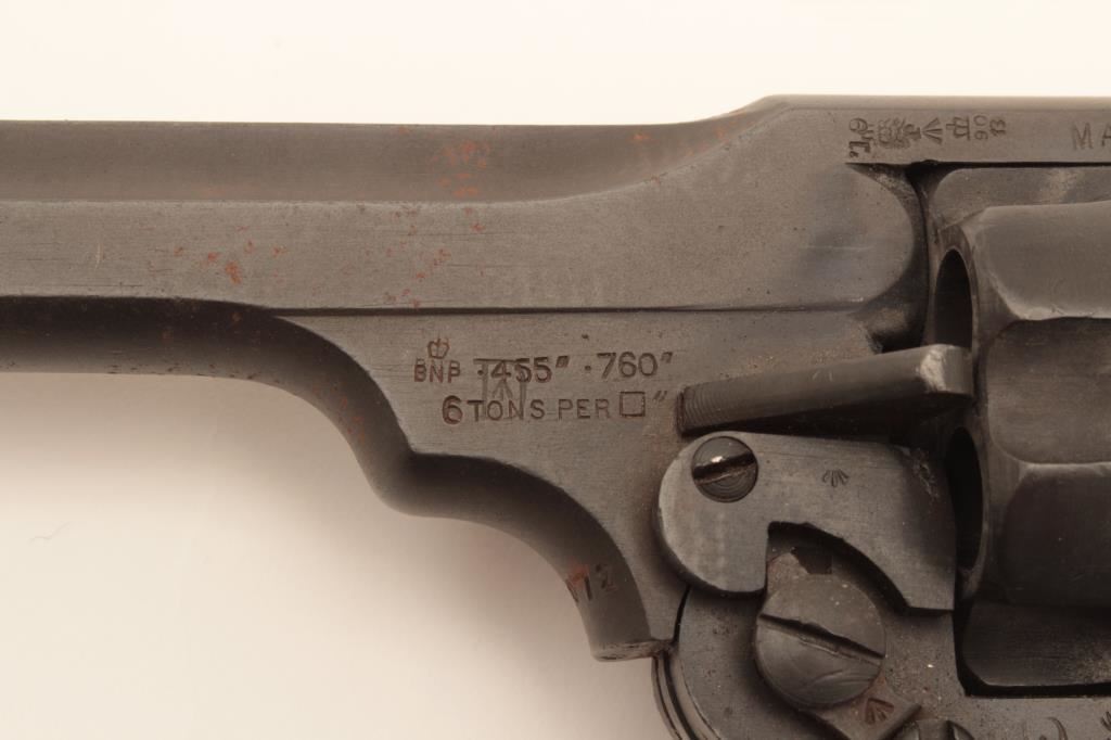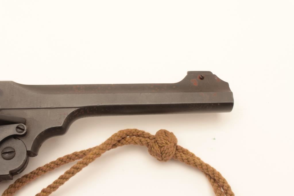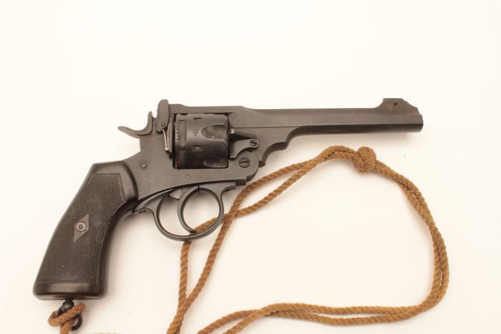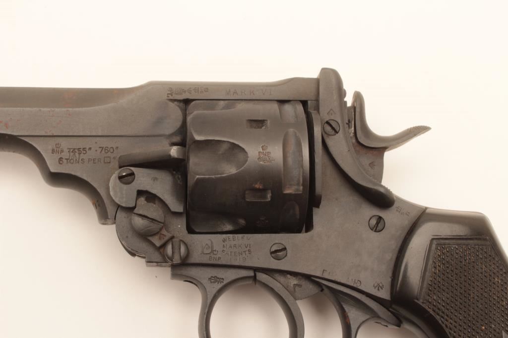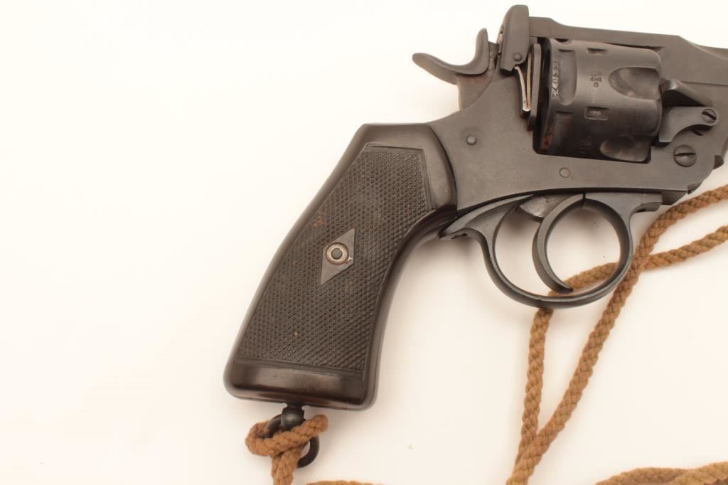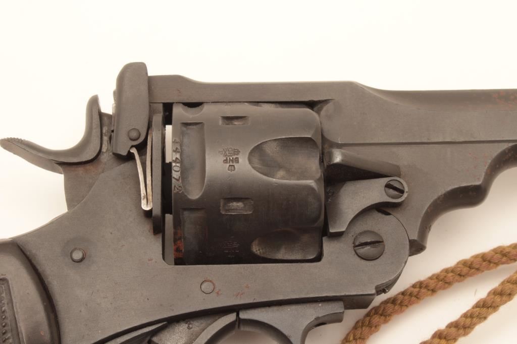 British Webley MK VI DA revolver, .455 caliber, 6” barrel, mat black finish, checkered hard rubber grips, S/N 444072; overall good to very good condition with majority of military finish remaining; some scattered surface rust from storage; good bore, crisp action, sharp markings and good grips; accompanied by a tan woven flap holster, braided lanyard cord and tan woven belt. (C&R/PPT). Est.: $500-$1,000.