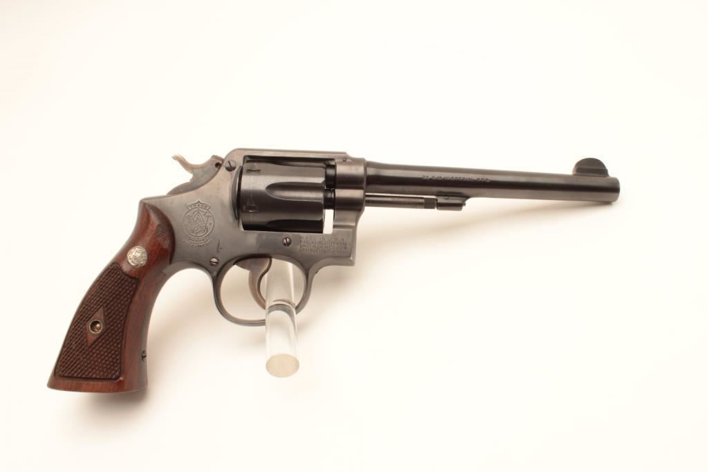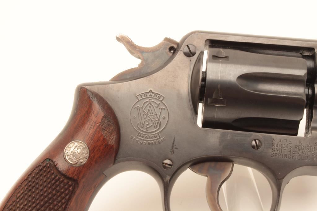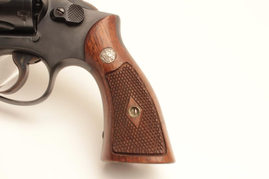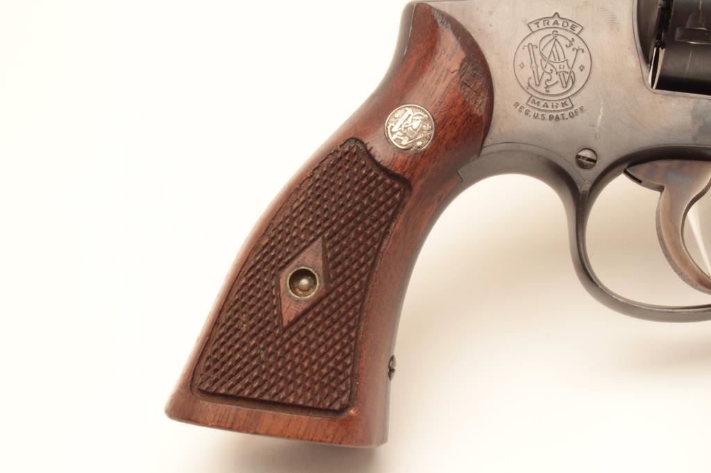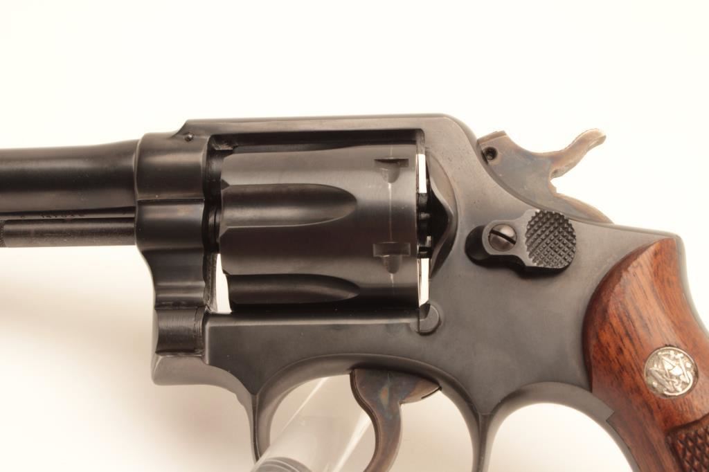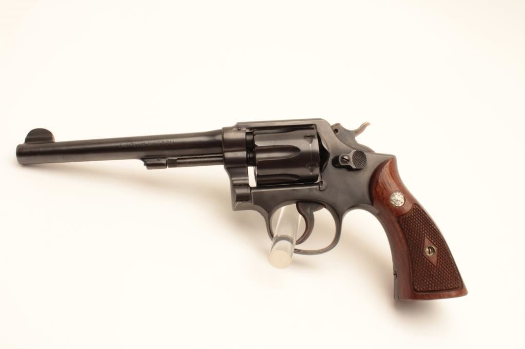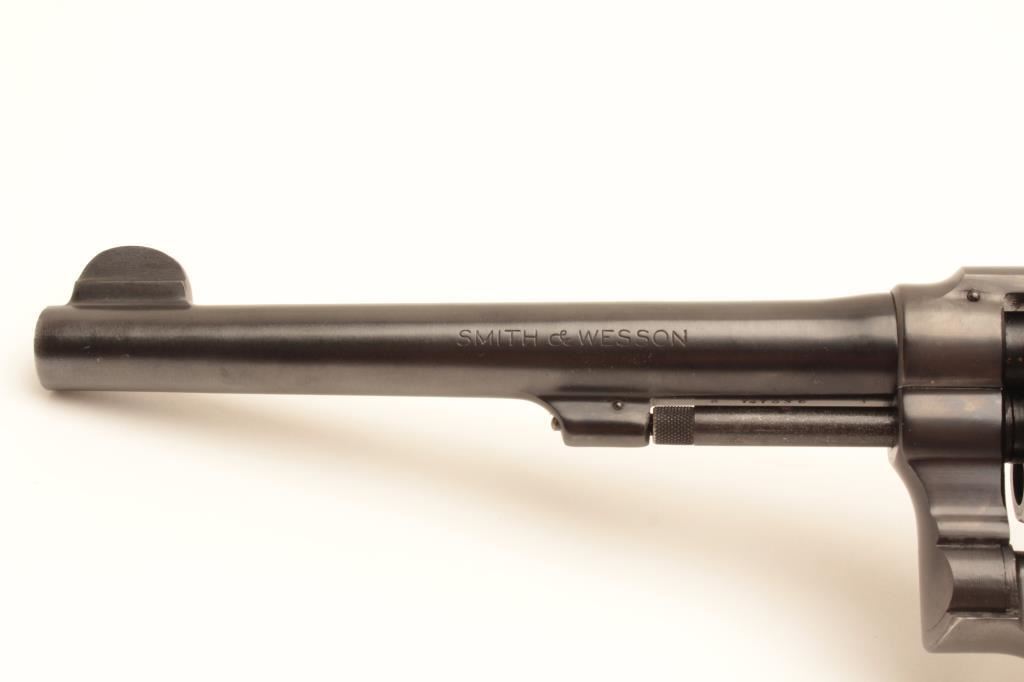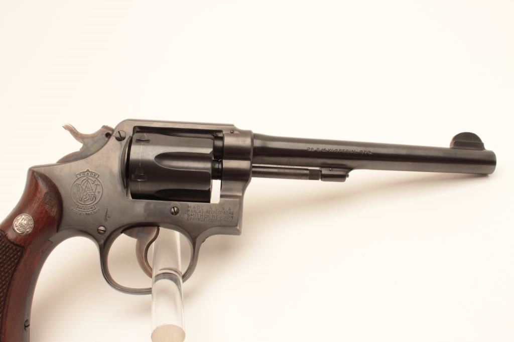 Smith & Wesson pre-war M & P DA 5-screw revolver, .38 Special caliber, 6” barrel, blued finish, checkered wood medallion grips, S/N C 141039; overall good to very good condition with majority of blued finish remaining, good bore, crisp action and markings, very good grips. (C&R/PPT). Est.: $300-$600.