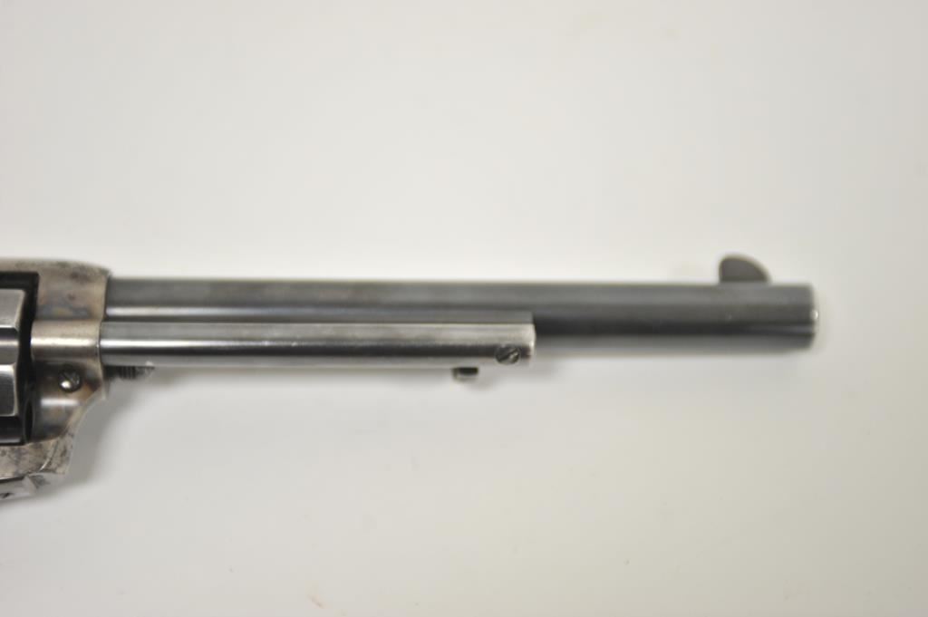 Colt Single Action Army revolver, 1st generation, .38-40 caliber with 7 ½” barrel, blue and case colored finish, period yellow stag grips, S/N 318307. (Collectors tag on guard reads “July 28,1911, blue, shipped Okla. City, Oklahoma.”) Not confirmed. 75%-85% original blue on the barrel and cylinder drifting at muzzle from carry in holster. Index line on the cylinder and loss of blue on the high points. 30%-50% case showing erosion and cleaning probably from holster also. The straps show 50% thinning blue at the gripping areas. The hammer shows like amount of case to the frame. Pristine interior and very bright bore. Tight action. The front sight is its full dimensions with feathering or polish around sight showing strong. The grips are well aged and of same era. Minor erosion and pinprick pitting. Once again likely holster damage and moisture. A nice 1st gen that may letter to OK. (C&R/PPT) Est.: $2750-$5500