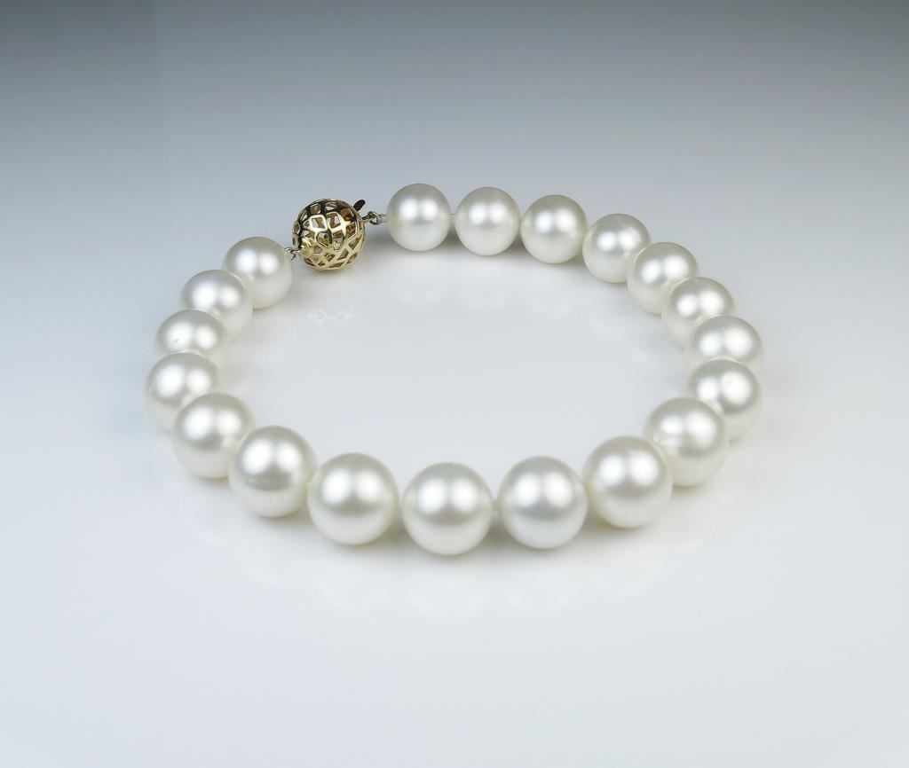 Luxurious South Sea Pearl Bracelet featuring Fine 12.00MM Ivory Pearls with rich luster accented with beautiful open ball style 14 karat yellow gold clasp. Full Appraised Value $11,000.00 Estimates $2,000-$4,000