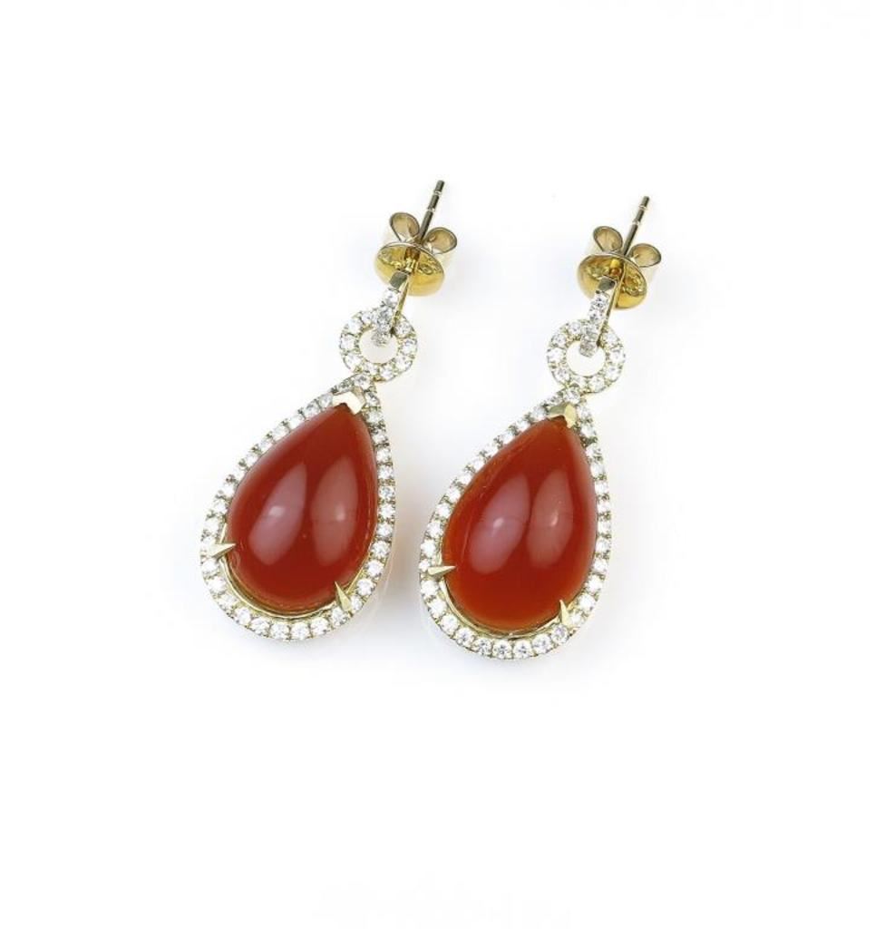 Glamorous Fire Opal and Diamond Earrings featuring 2 cabochon pear shaped Fire Opals weighing approx. 9.00 carats total surrounded by 96 ‘IDEAL’ cut Diamonds weighing approx. 1.50 carats with F-G colors and SI clarity in 14 karat yellow gold settings. Full Appraised Value $6,000.00 Estimates $3,000-$4,000