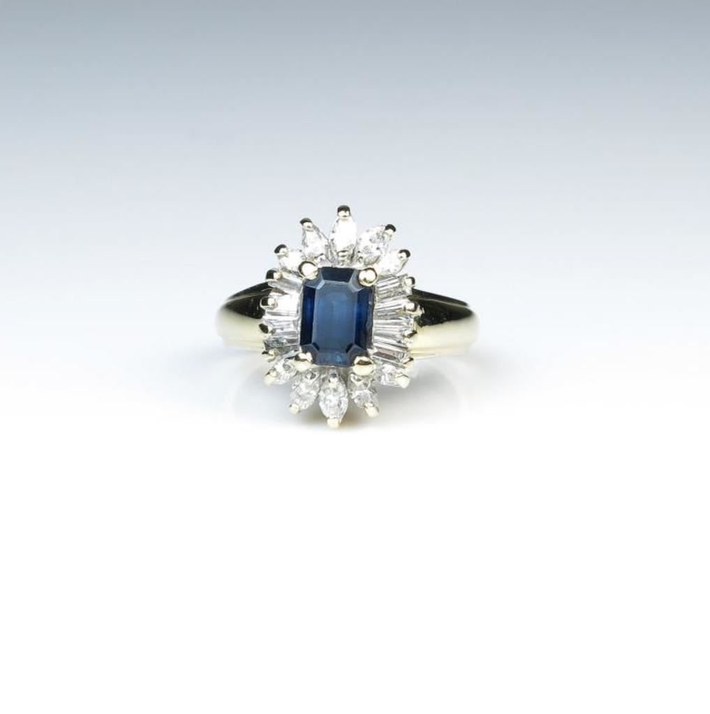 Elegant Blue Sapphire and Diamond Ring featuring an approx. 1.00 carat emerald cut Blue Sapphire beautifully framed with a combination of 18 MQ and baguette cut Diamonds weighing approx. 1.20 carats with F-G colors and VS/SI clarity set in 14 karat yellow gold setting. Retail $3,000-$4,000 Estimates $1,500-$2,000