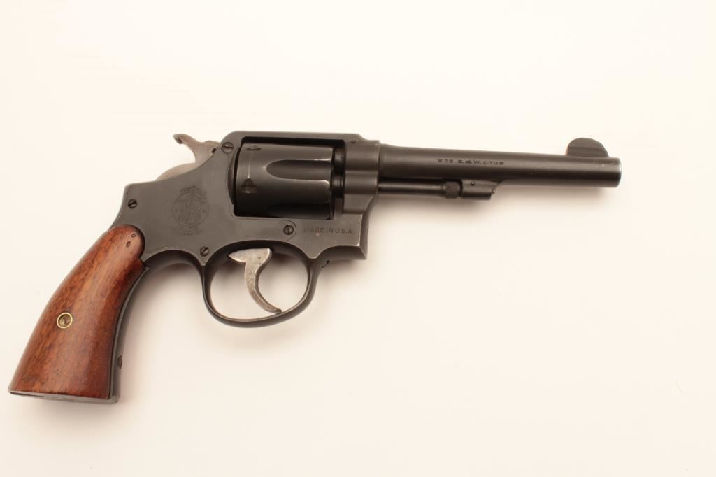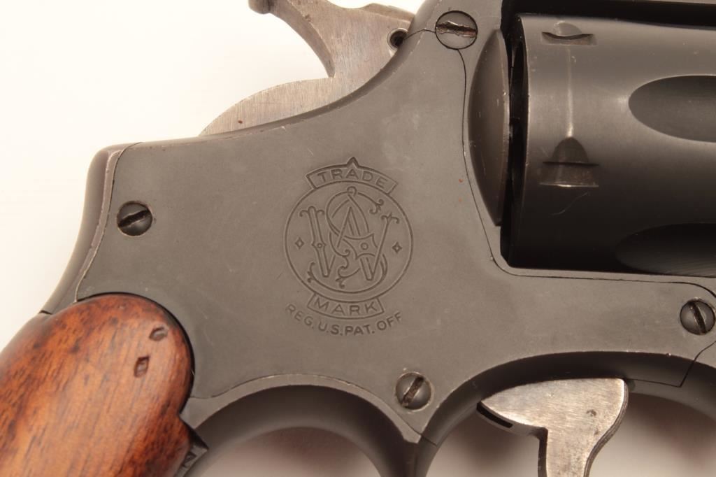 Smith & Wesson Victory Model DA revolver, .38 caliber, 5” barrel, parkerized finish, ordinance bomb and “W.B.” stamping on butt strap, wood grips, lanyard ring ground off, S/N 923678; overall good condition with good bore, action, markings and grips. (C&R/PPT). Est.: $250-$500.