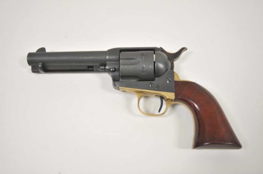 Uberti Single Action Revolver in .357 Mag caliber with a 4 ¾” barrel, dull blue matt finish, brass straps with wood grips, S/N J96338. Fine to excellent condition. Minor index line. Slightly used. 98%-99% in box. (Modern/PPT) Est.: $250-$500