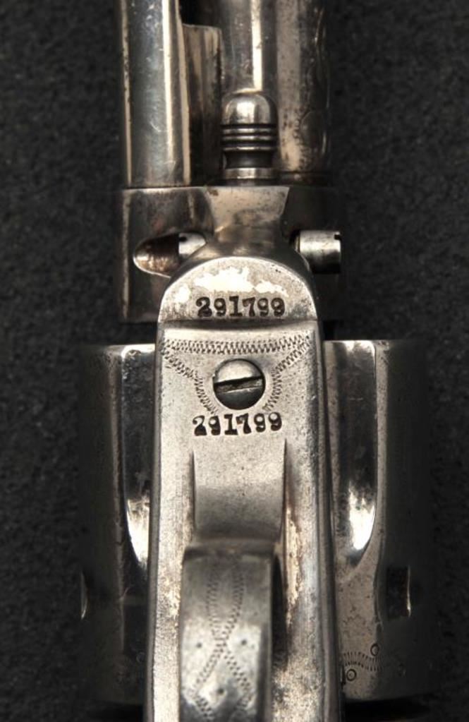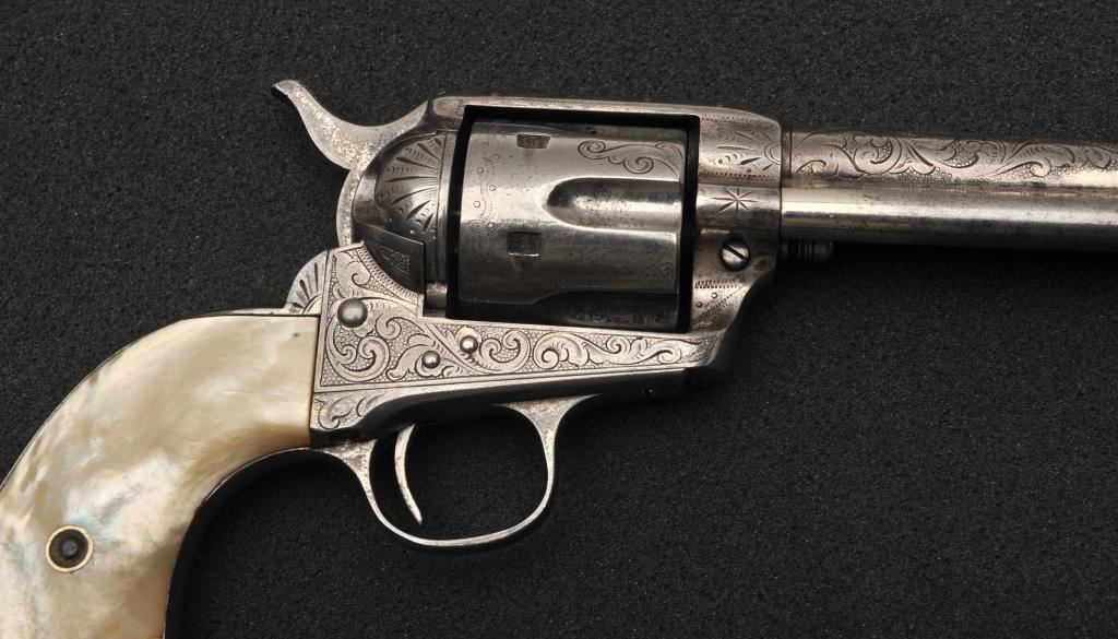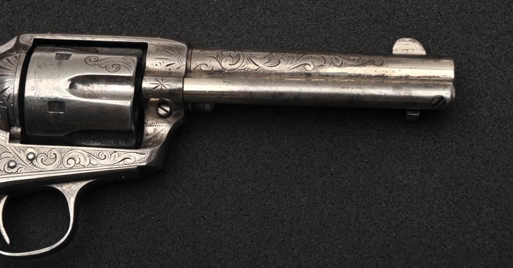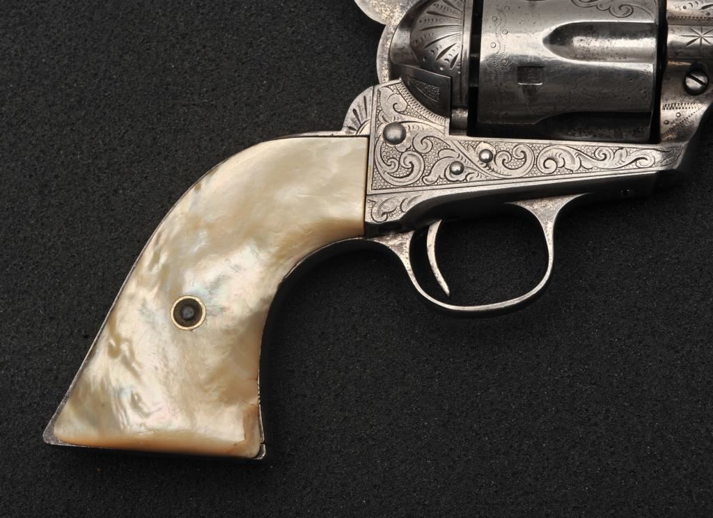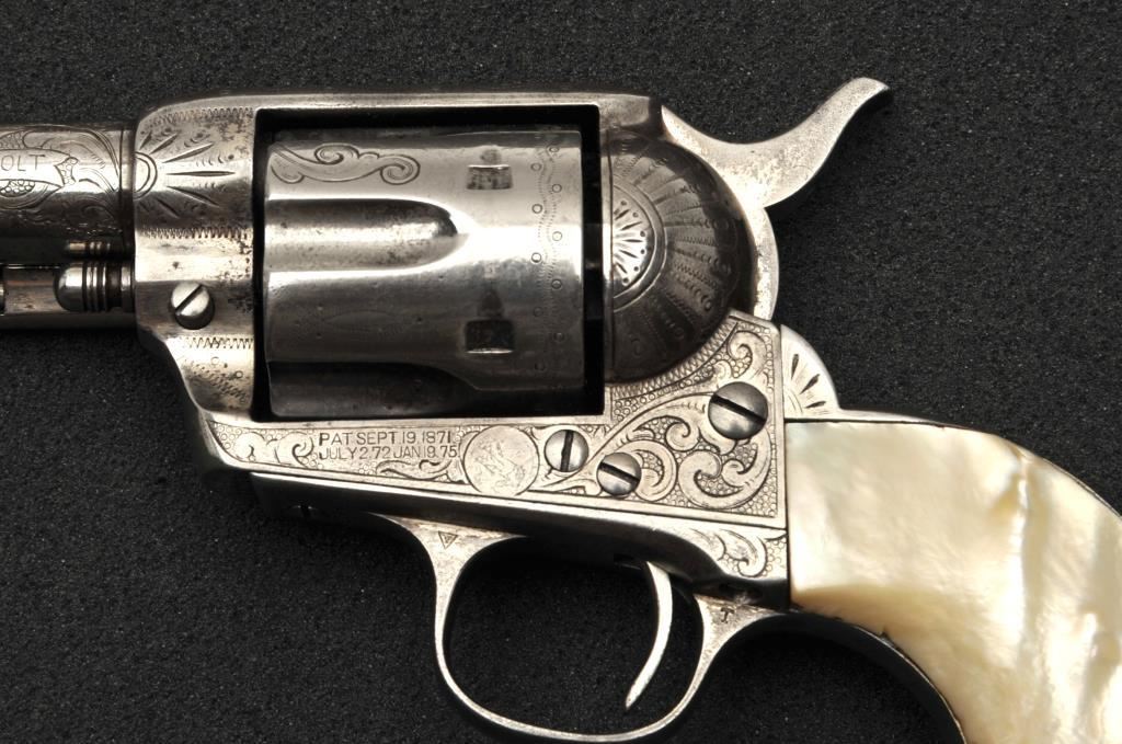 Colt Single Action Army revolver in .45 Colt caliber with a 4 ¾” barrel, nickel finish, pearl grips, and factory engraved shipped to H&D Folsom Arms, Co., New York, N.Y., April 6, 1907, 4 guns in shipment. All features verified by factory letter (Included) except stocks “Not Listed”. This Colt remains in original good to vry good condition with 10%-20% original nickel mostly drifted and lightly cleaned to gray metal patina. Good edges and slightly light markings. All matching visible numbers. The grips are slightly undersized with small losses and chips but definitely of same era. The front sight has been slimmed very slightly. Good action and good overall. Classic engraving pattern. (C&R/No PPT) Est.: $6,000-$12,000