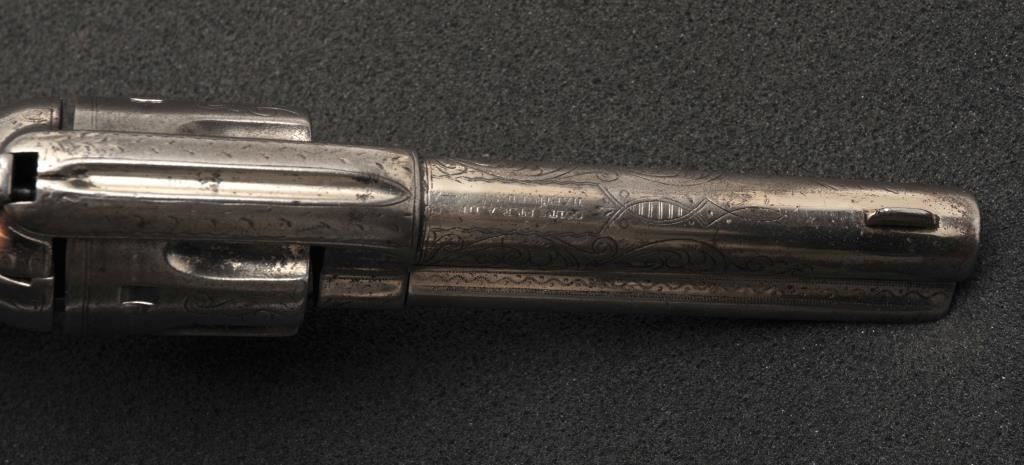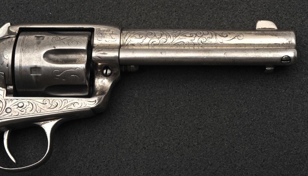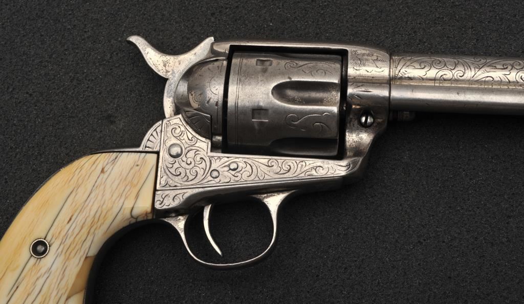 Colt Single Action Army revolver in .45 Colt caliber with a 4 ½” barrel, silver finish, ivory grips, factory engraved, Shipped to Norvell Shapleigh Hardware Co, St. Louis, Missouri, Dec. 22, 1908, 1 gun in shipment. Features verified by factory letter except stocks “Not listed”. Good traces of silver with natural patina and good markings that are only slightly light. The grips are cracked and aged with repairs and are undersized but of same era. The front sight has been slimmed and is reduced in height. All matching numbers. The bore is fair and the action is a bit “Loose”. Silver finish is desirable and a 1 gun in shipment denotes special order and perhaps recorded in newly discovered ledgers. (C&R/No PPT) Est.: $5,000-$10,000