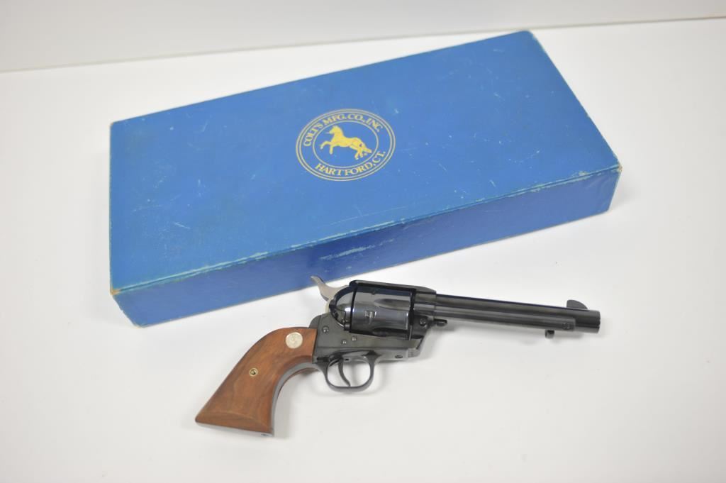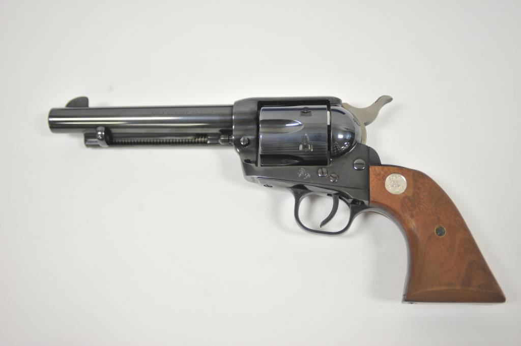 Limited and out of production Colt “Cowboy” single action revolver, S/N TF09782 in .44-40 caliber with a 5 ½” barrel, full blue finish, and medallion wood grip. Excellent condition in box. 97%-99% overall. Minimal index line and very limited to almost no use. (Modern/PPT) Est.: $750-$1500