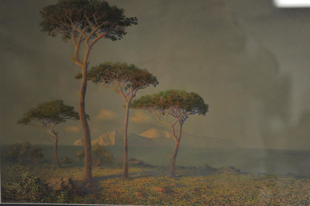 Framed and matted color litho of trees on the Island of Capri; approximately 24” x 30” overall signed George Elbert Burr/1918, lower left corner. Est.: $200-$400.