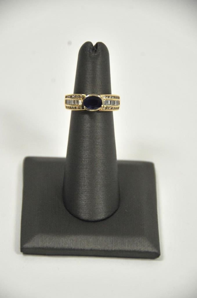 High quality 14k custom made ladies ring set with deep blue sapphire and diamonds. Sapphire is oval shaped and 1/2 carat plus. High quality baguettes and small round diamonds. 5 gram weight. A far above average sapphire from and estate. Est. $350-700