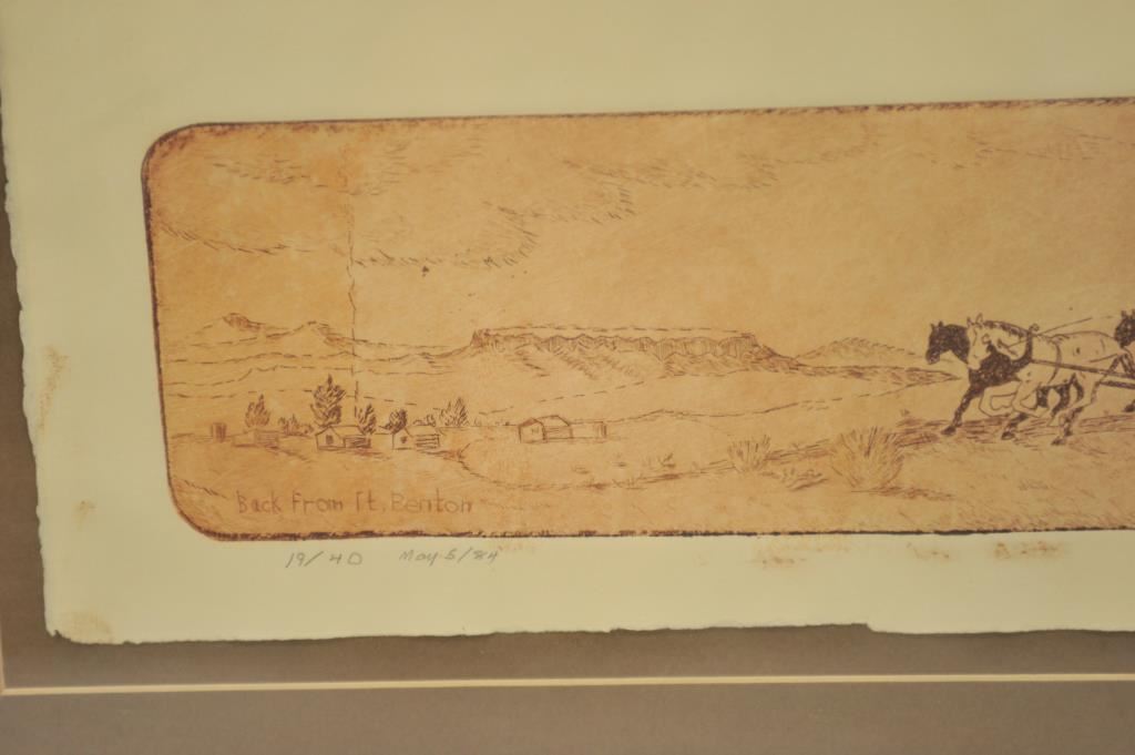 Framed and matted etching entitled “Back from Ft. Benton” (19/40; May 5/84), signed Gordon Obie; approximately 15” x 27” overall. Est.: $150-$250.