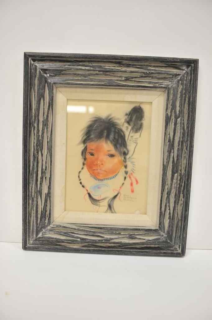 Framed charcoal of young Indian girl by Nancy McVaughlin Powell; approximately 21” x 18” overall. Est.: $150-$300.