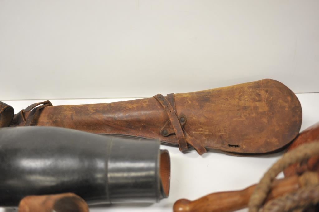 Misc. lot of leather holsters, two bull whips, one pair of stirrups, a small, narrow pair of leather saddlebags and a leather scabbard for a carbine or short rifle. Est.: $200-$300.