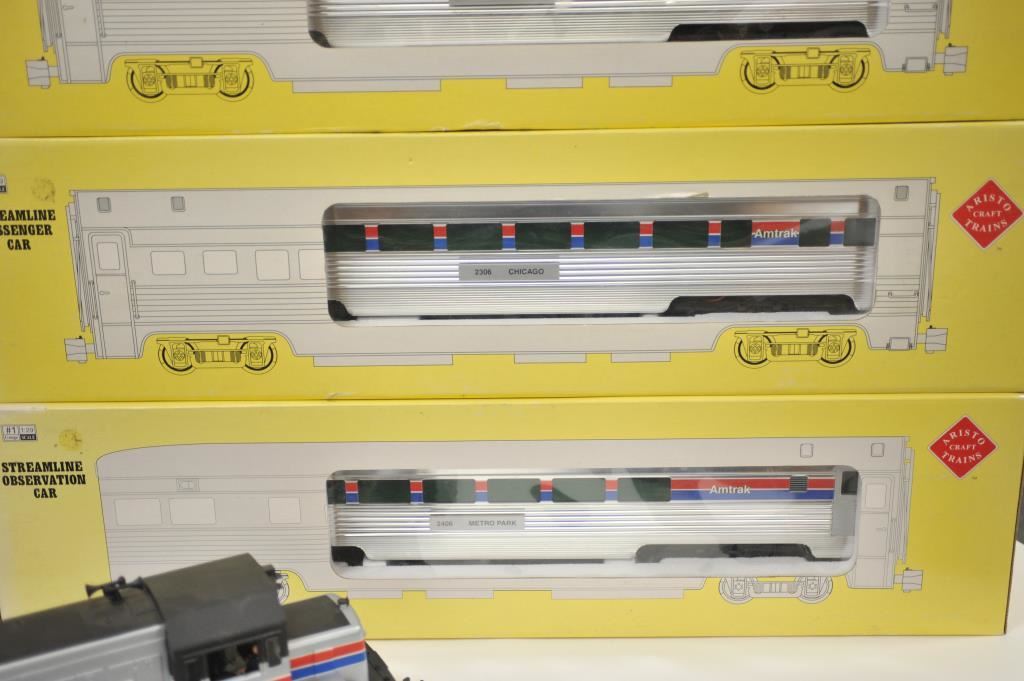 Lot of 6 big boxed Aristo Craft Train cars (#1 gauge/1:29 scale), like new, including an Amtrak Engine, a Coach ATK/AMTRAK car, A Diner AMTRAK car, an Observation AMTRAK car and two additional locomotive engines (one marked Santa Fe). Est.: $400-$800.
