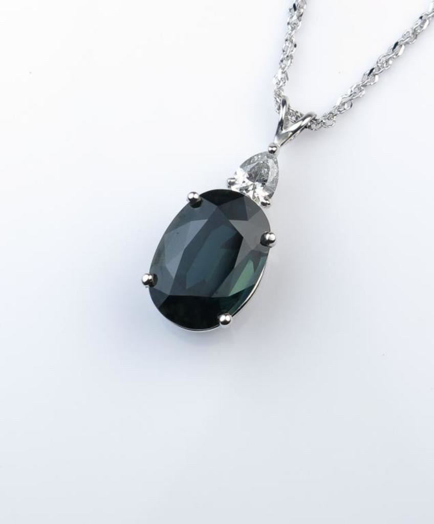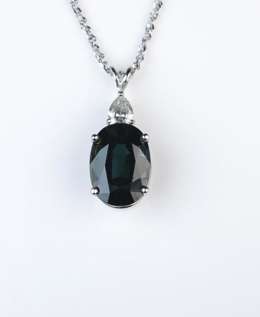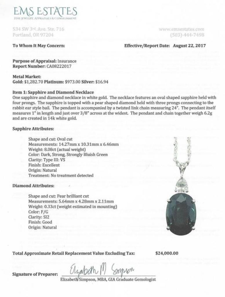 Spectacular AAA Quality 8.08 carat Green Sapphire and Diamond Pendant featuring a 100% Natural Sapphire with No Treatment VVS clarity and rich blue green color accented with a pear shaped Diamond weighing 0.33 carats with F-G colors and SI clarity set in 14 karat white gold setting. Full Appraisal Value $24,000.00 Estimate $8,000-$12,000