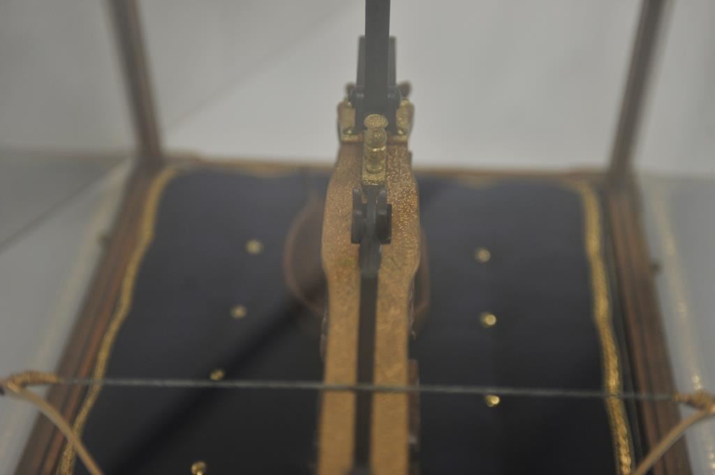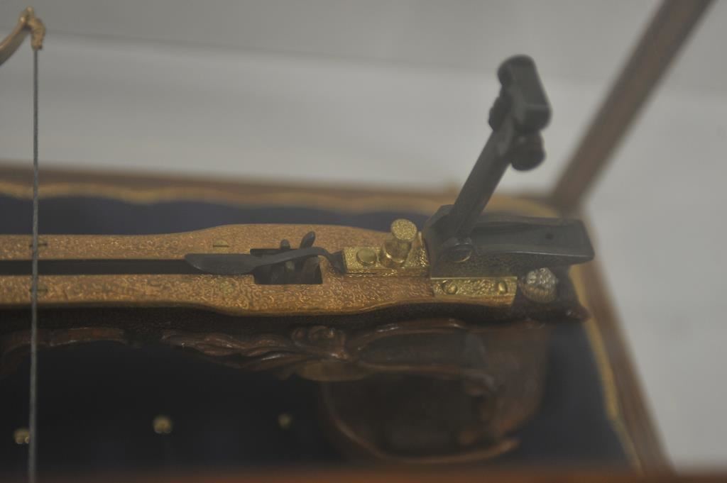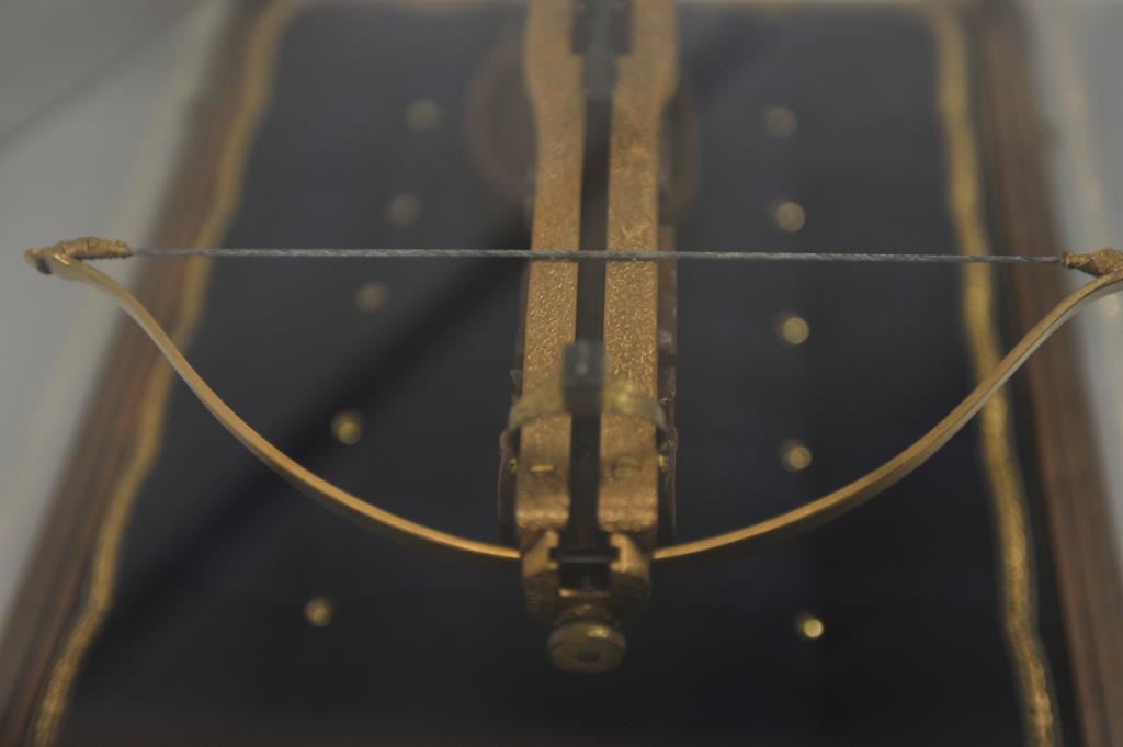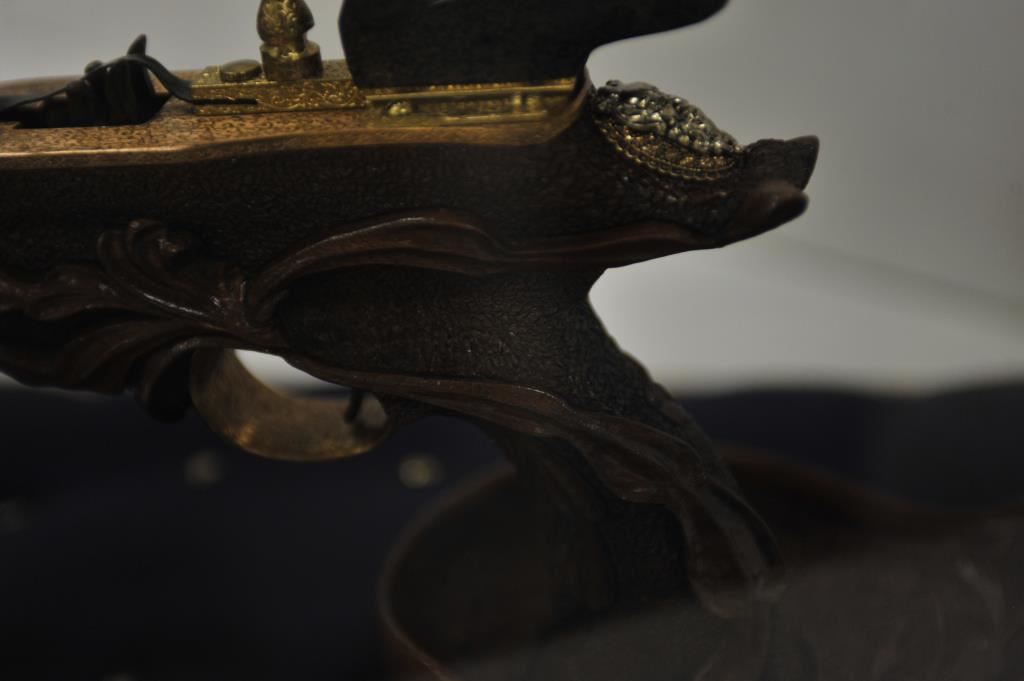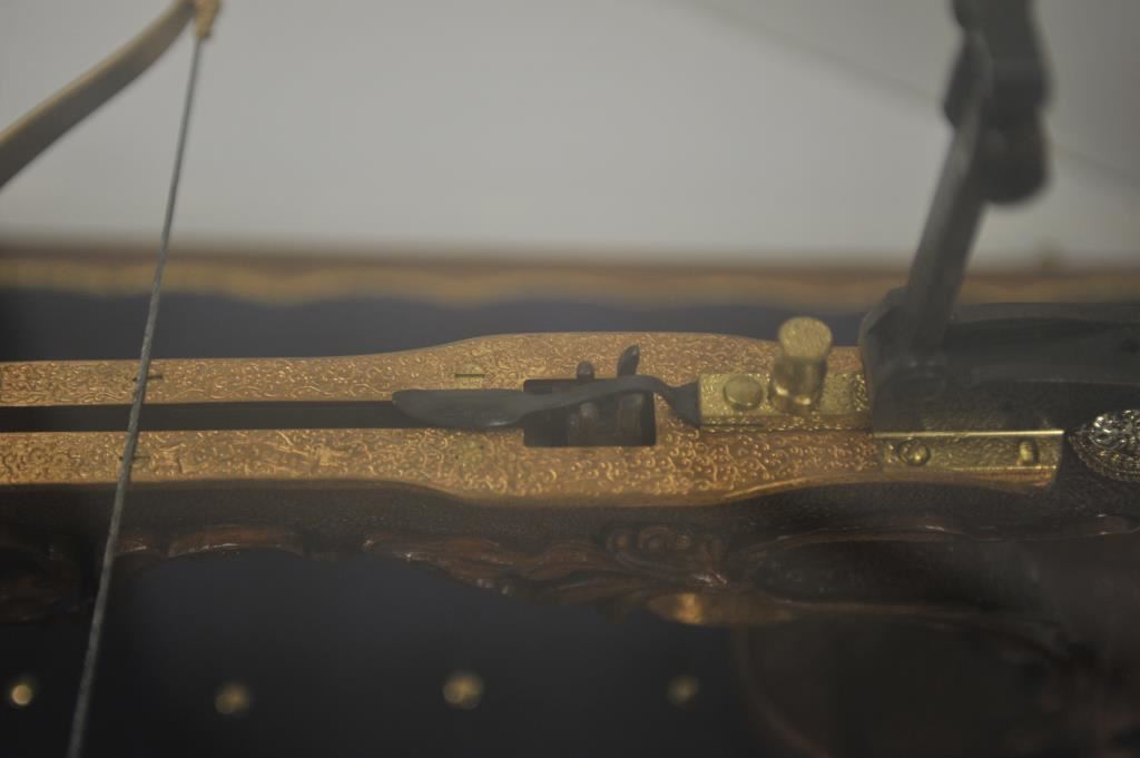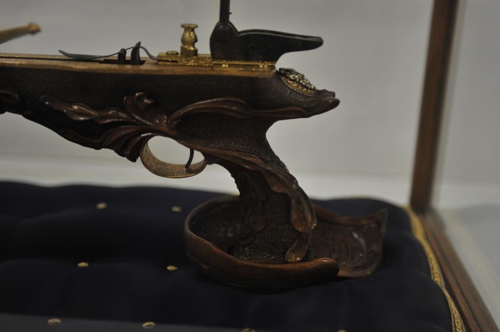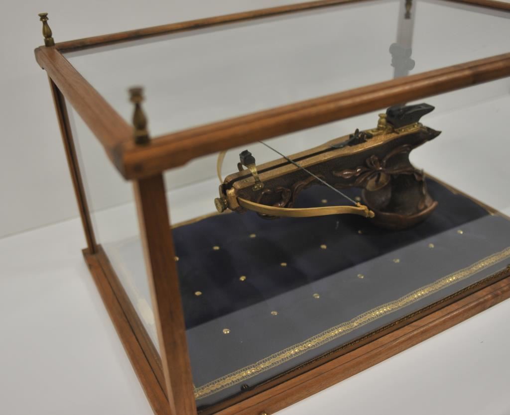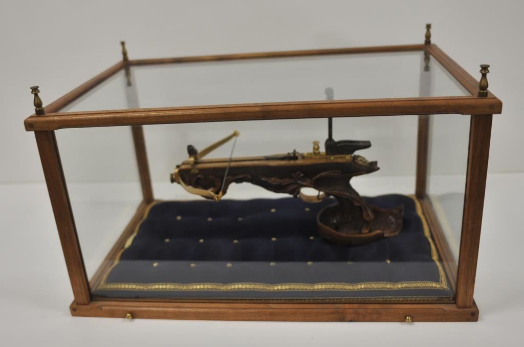 Finely accomplished custom crafted pistol size crossbow, approximately 15” long 8” in height with large flip-up rear sight and post front sight; metal parts are finely engraved and gold washed; wood stock is beautifully relief carved; fierce silver gargoyle face is affixed to rear top part of stock; crossbow is contained in wood and glass display case, dimensions are approximately 24” x 14” x 15”. Est.: $1,000-$1,500.
