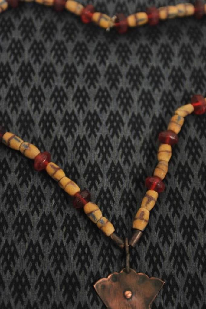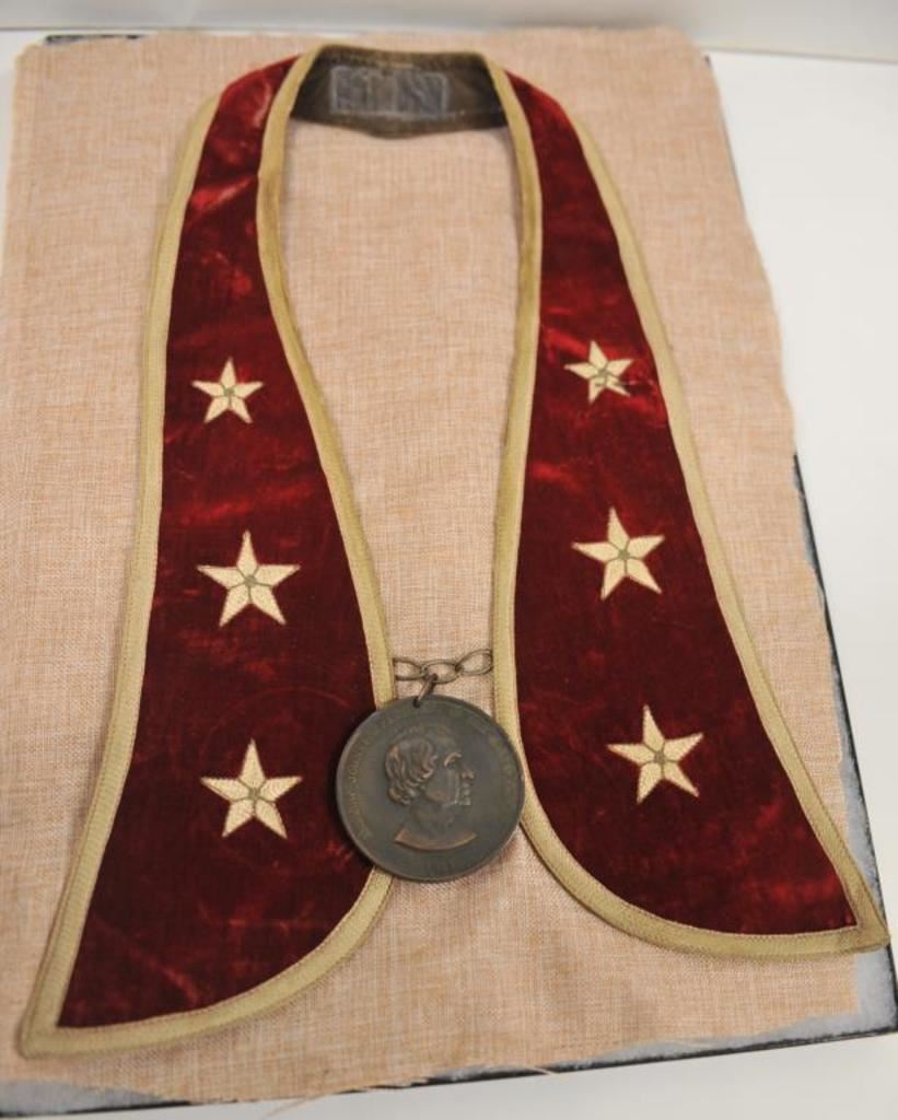 Lot of 3 beaded necklaces with Hudson Bay Co.-type modern copper and brass reproduction amulets; beads appear to be old; also a cloth ceremonial necklace sash with Andrew Johnson peace medal showing a nice dark patina but age of medal and cloth ceremonial sash are unknown; 2 in complete riker cases, 2 missing their glass/cardboard covers. Est.: $300-$400.