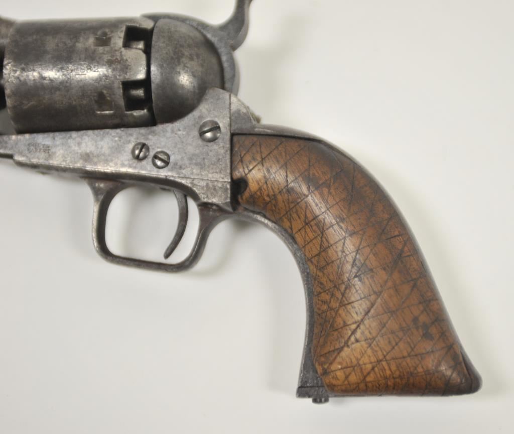 Colt 1851 London Navy revolver in .36 caliber percussion with iron trigger guard and London address, S/N 38882. Fair to good overall condition with gray/brown patina finish. Some fair deep pitting and cleaning overall. The barrel address is light but visible. Matching visible numbers and clear Colt’s patent on the frame. The grips are worn with losses and old crude cross hatching or carving. Working and fairly tight. Rammer knocked off center slightly,. Civil War era. (Antique) Est.: $600-$1200
