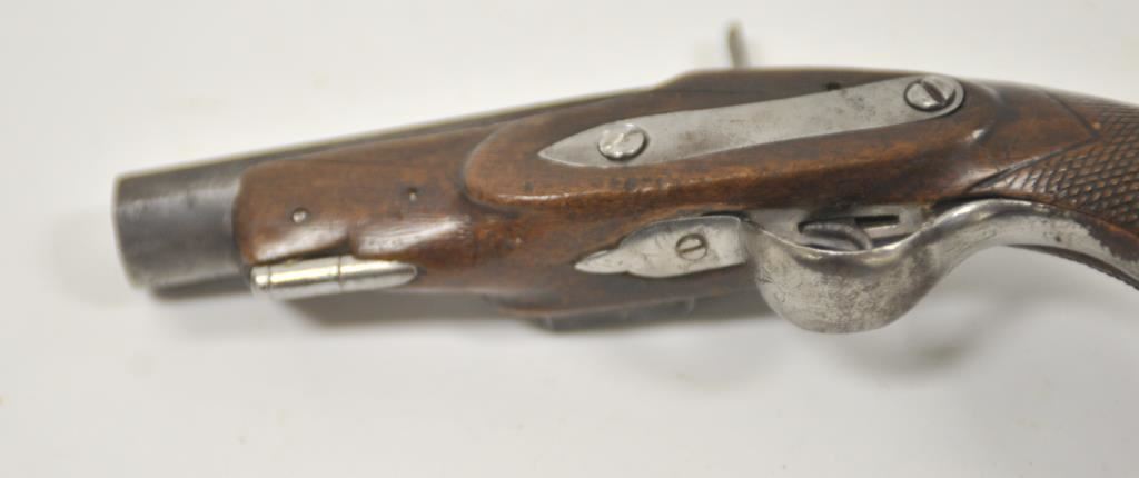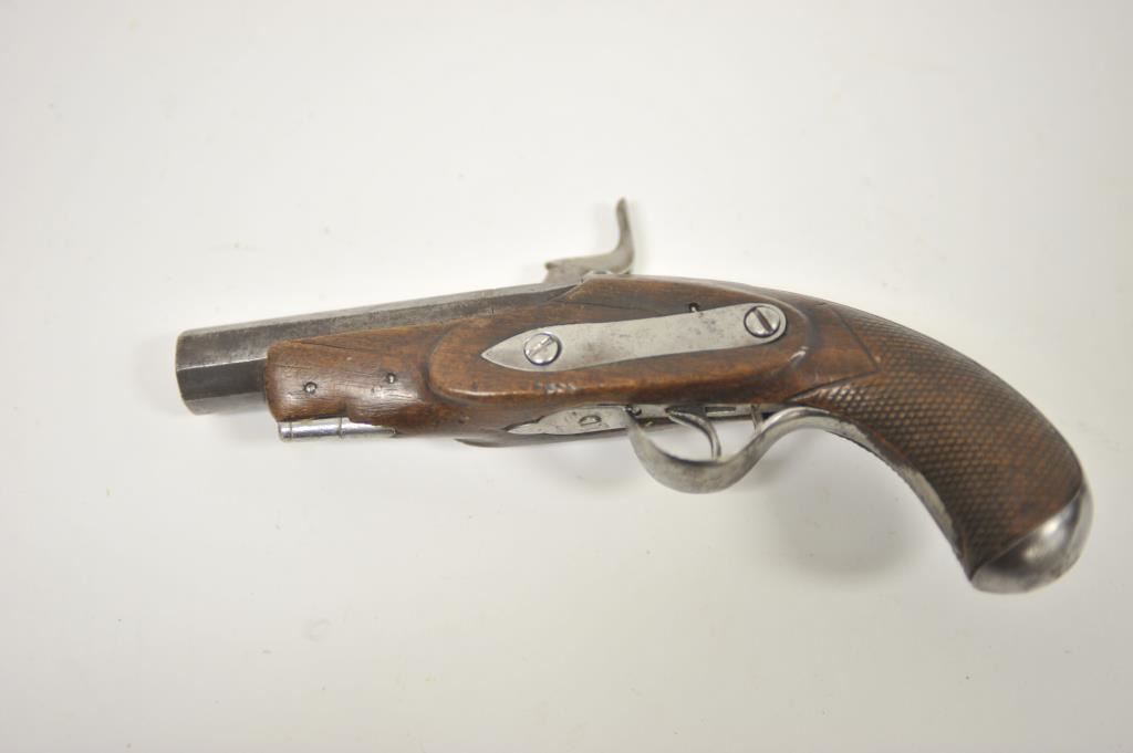 Miquelet percussion pocket size pistol with octagonbarrel and checkered stock. No proofs or markings circa Mid-19th century. Measures 9” overall with a 4 1/8” barrel of .69 caliber smoothbore. Missing ramrod. Working action. Some light cleaning but good overall. (Antique) Est.: $300-$600