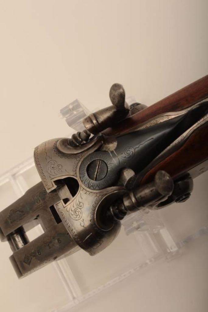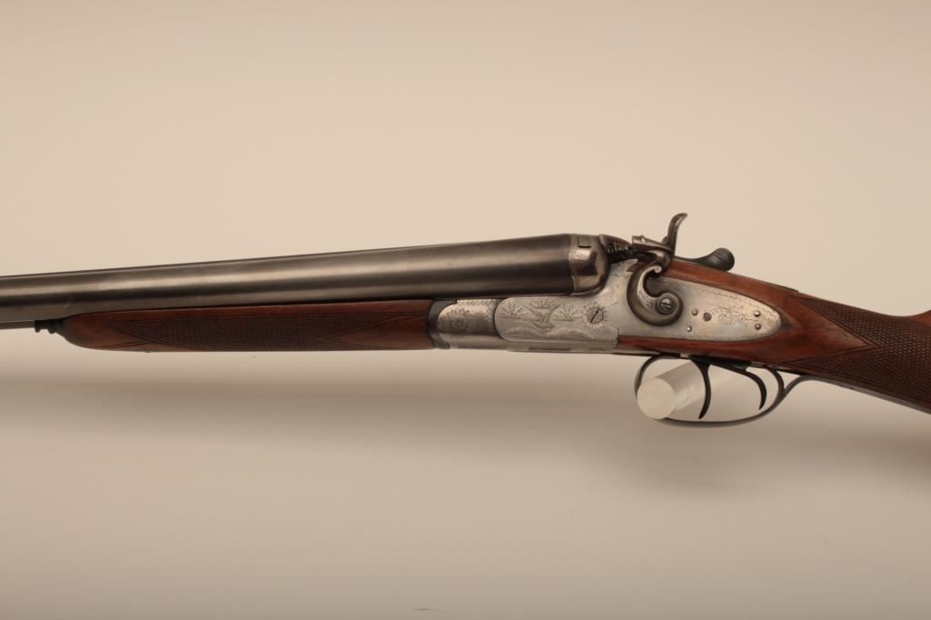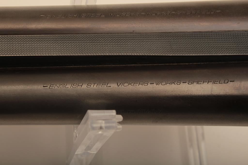 I. Marco Brescia Italy marked 12GA SxS shotgun with vikers steel, Sheffield marked barrels, exposed hammers, double triggers, standard extractors, and English style straight stock, S/N 6167. Interesting Greener cross bolt and dolls head locking mechanism. The barrels measures 27 ¾” and choked full and full. 50%-70% thinning blue on the barrels with one thumbprint 9” down on the left barrel from action. Satin gray frame is very good. The stocks are very good with hair line crack just starting behind the left lock plate. Locks tight with good bores. An interesting gun we would date shortly after WWII to 1970s before Brescia re-emerged as gun making center and British steel was sought after. Est.: $600-$1200