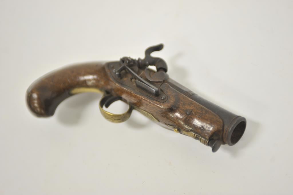 Miquelet percussion pocket pistol with large bore cannon barrel. Measures 7 ½” overall with a 3 ¼” barrel of .75 caliber smoothbore. Brass mounts in continental rather than Spanish style. Dark patina finish with minor erosion and pinprick pitting. Not holding on full cock but working. Good wood and generally good overall. Made from Spain through Italy into Mediterranean in this style during early 19th century. No absolute identifying characteristics. 50/50 chance on whether Spanish or Italian. (Antique) Est.: $300-$600