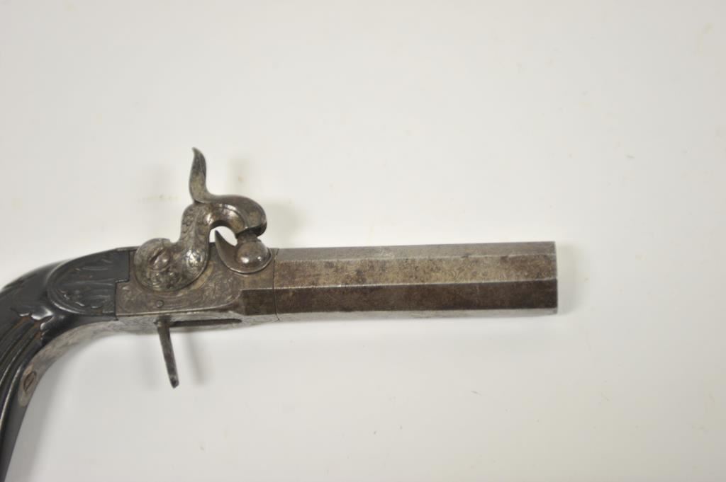 French style percussion pocket pistol with fluted ebony or dark hard wood grips circa about 1850. Measures 7 ¾” overall with a 3 ¼” barrel of .62 caliber smoothbore. Good quality. “ELG” (Belgium) proof. Working. Good condition with some rust, light erosion, and minor pitting. (Antique) Est.: $250-$500
