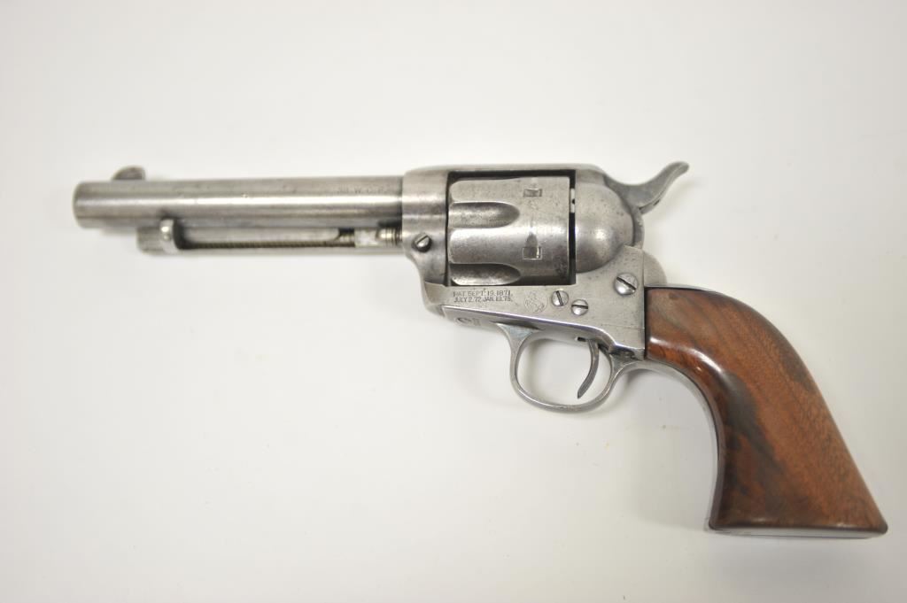 Colt 1st Generation .38-40 caliber single action revolver with a 5 ½”’ barrel, S/N 173017 made about 1895-96. Gray patina finish with traces of blue and case where protected. Some old light cleaning. Good address and markings. All matching visible serial numbers. Front sight slimmed very slightly at the edge. Earlier Colt one piece wood grips fitted to this single action and refinished long ago. Good action and good to very good bore. Out of estate and not lettered. (Antique) Est.: $1400-$2800