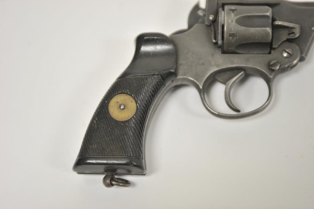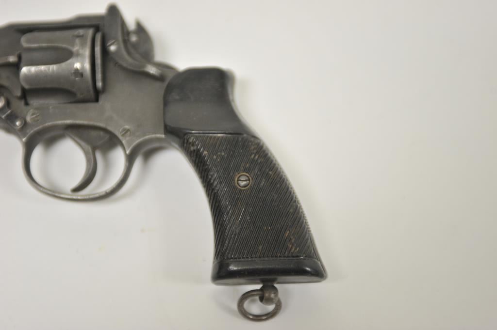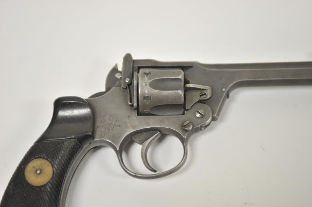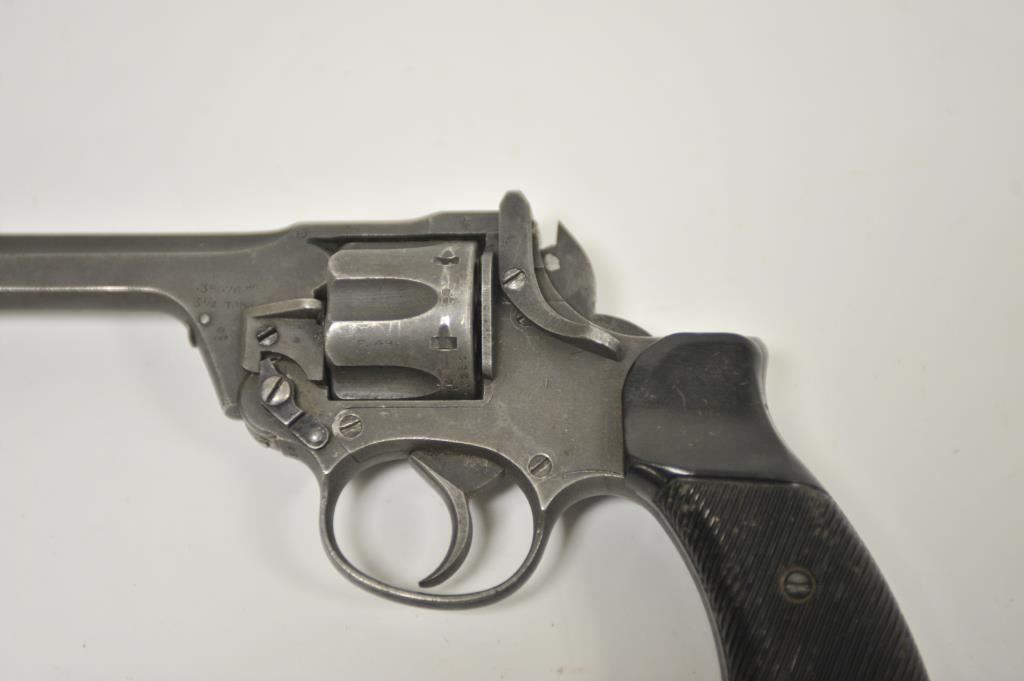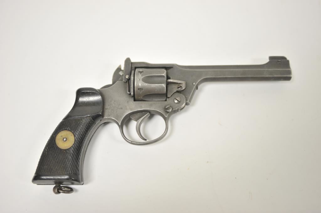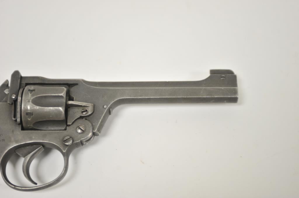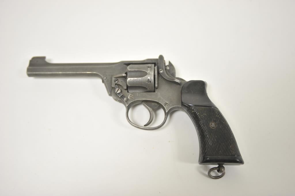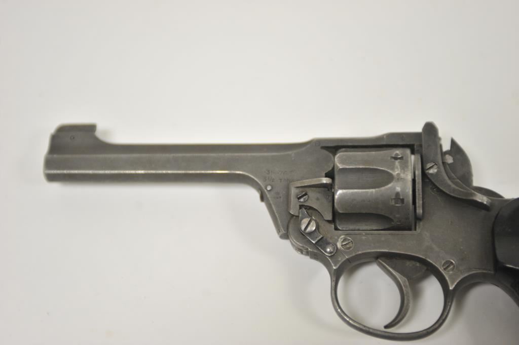 Enfield No. 2 MK I .38-200 caliber double action revolver dated 1934. Broad head proofed with war time parkerized finish, spurless hammer and composite grips. Minor scratching and storage. Very good plus overall with good markings. (C&R/PPT) est.: $250-$500