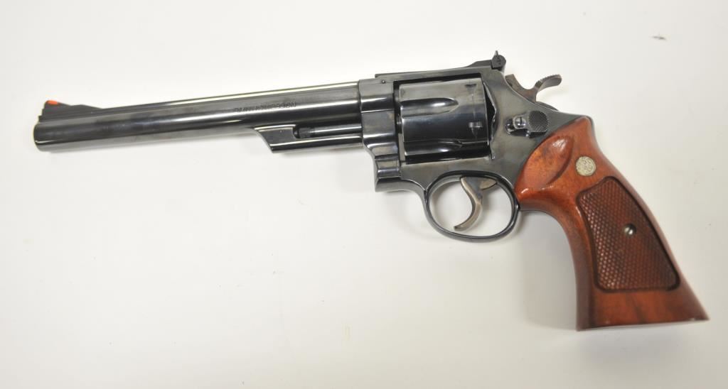 Smith & Wesson 29-2 .44 Mag caliber Double Action revolver with 8 3/8” barrel, target features, blue finish, in presentation display case, S/N N465636. This revolver remains in near fine condition with 97%-99% original blue finish. Slight index line on cylinder. 90% case colors. Evidence of limited firing and minor use. The grips are also near fine. Minor tears to satin lining on case. With cleaning rod but no screw driver. Great action and bright bore. Shows early quality. A 9 on a 1-10 grading scale. (Modern/PPT) Est.: $700-$1400