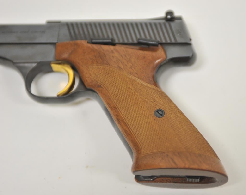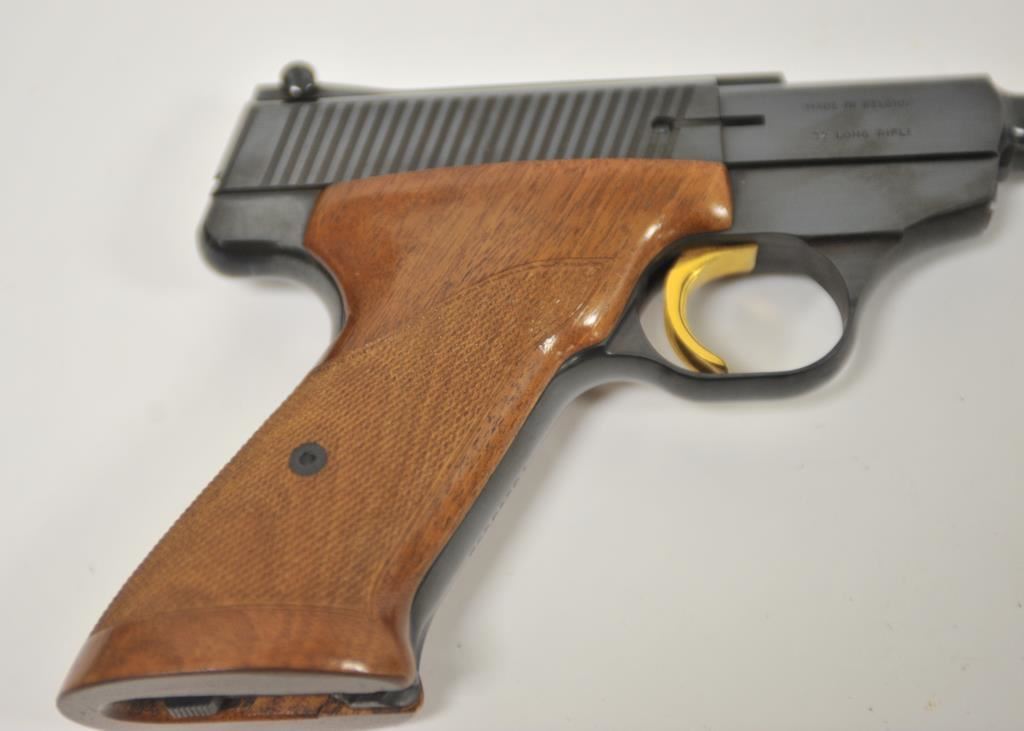 Belgium Browning Challenger II .22 caliber semi-auto pistol, S/N 130430U9 with 6” barrel, checkered wood grip and gold trigger. Fine to excellent used condition. 98%-99% overall. Minor use and firing. Excellent grips. 1 correct magazine. (Modern/PPT) Est.: $300-$600