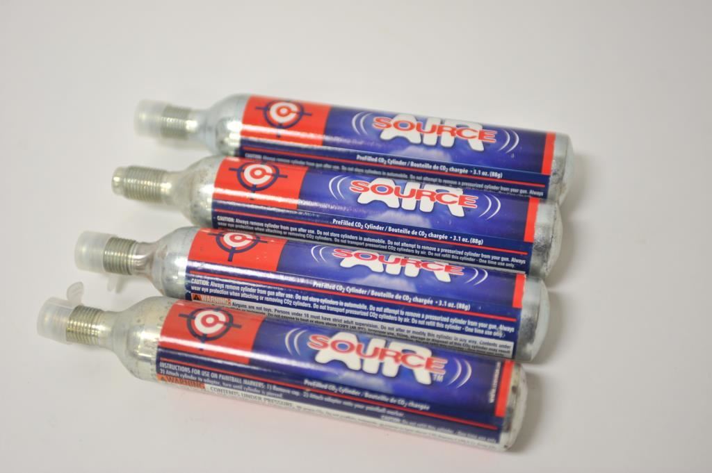 Crosman Air Source pre-filled CO2 cylinders. The lot includes thirteen unopened cylinders and one refillable Extreme Rage 4 ounce metal canister. Est.: $50-$100.