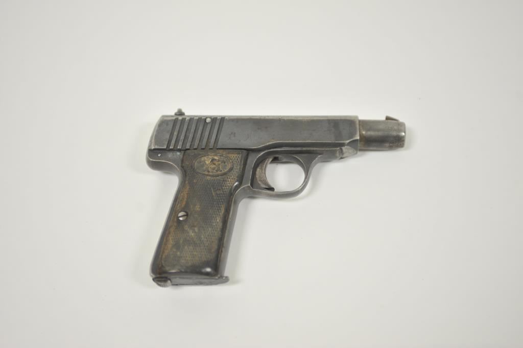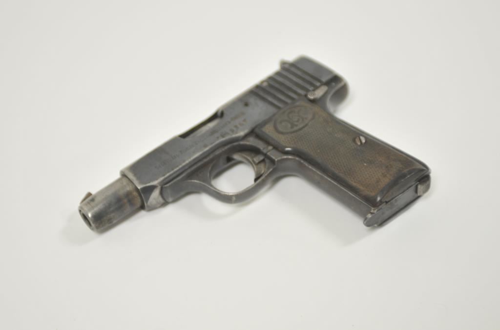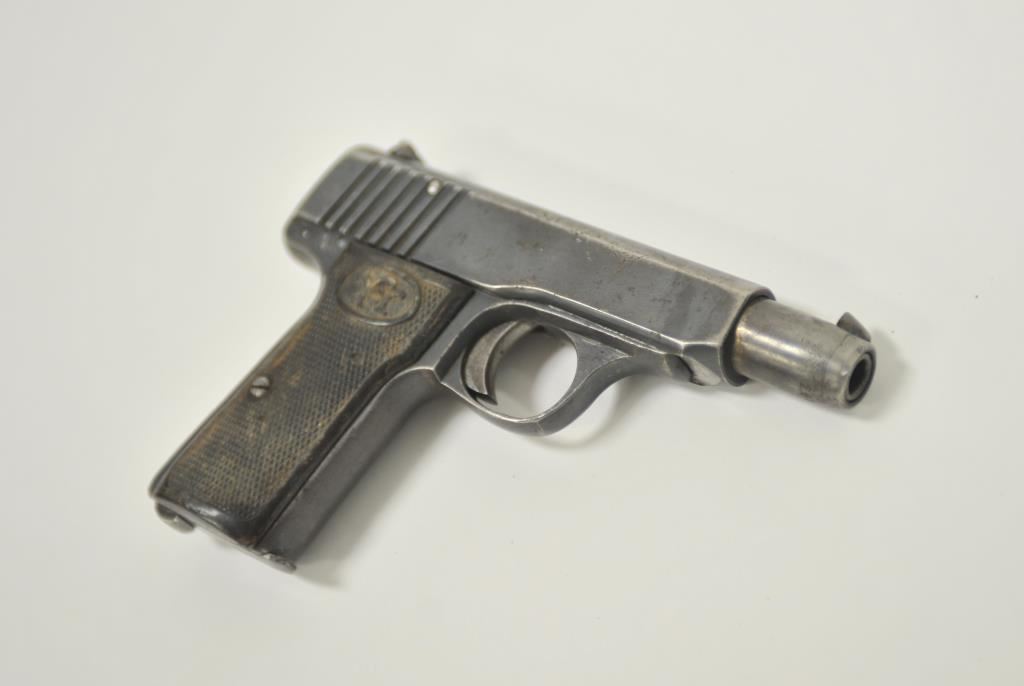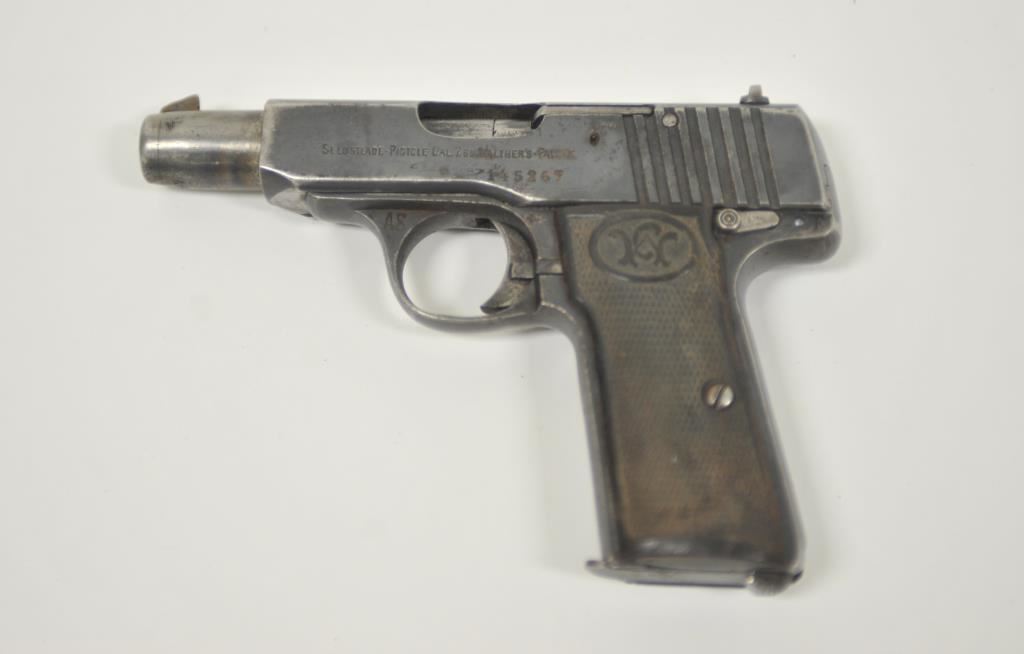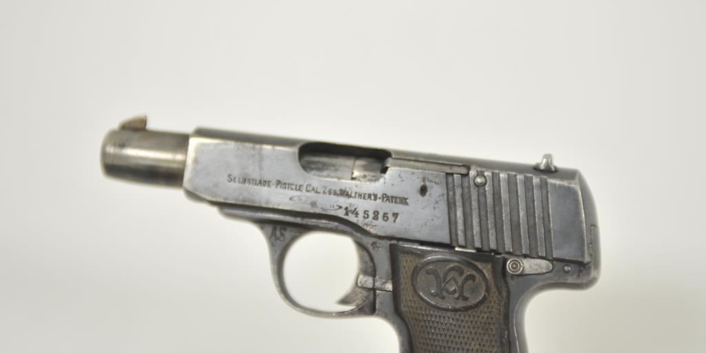 Walther pocket Selbstlade semi-automatic pistol, 7.65mm caliber, 3.5” barrel, blued finish, checkered hard rubber grips, S/N 145267, “AS” stamped on left forward side of trigger guard (Police?); overall uncleaned condition with considerable blued finish remaining, good action and markings, bore may clean to good, fair to good grips. (C&R/PPT). Est.: $250-$500.