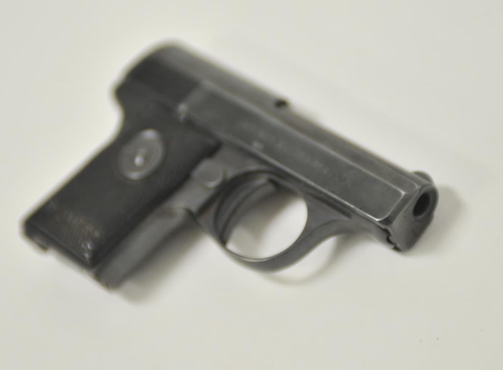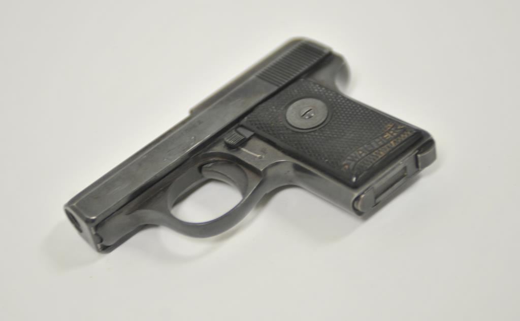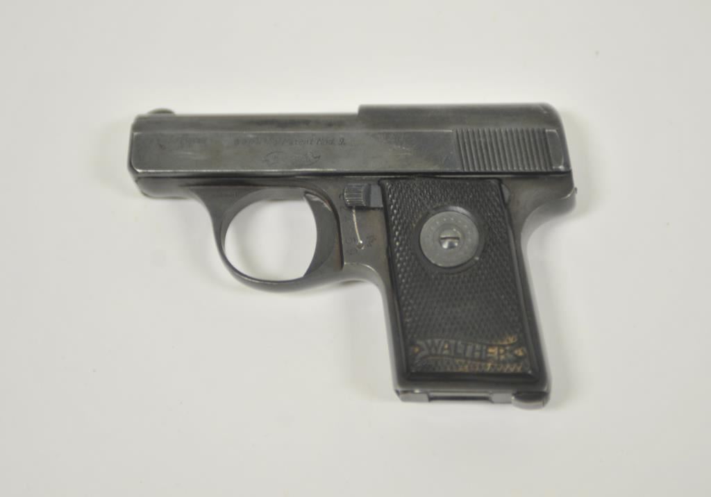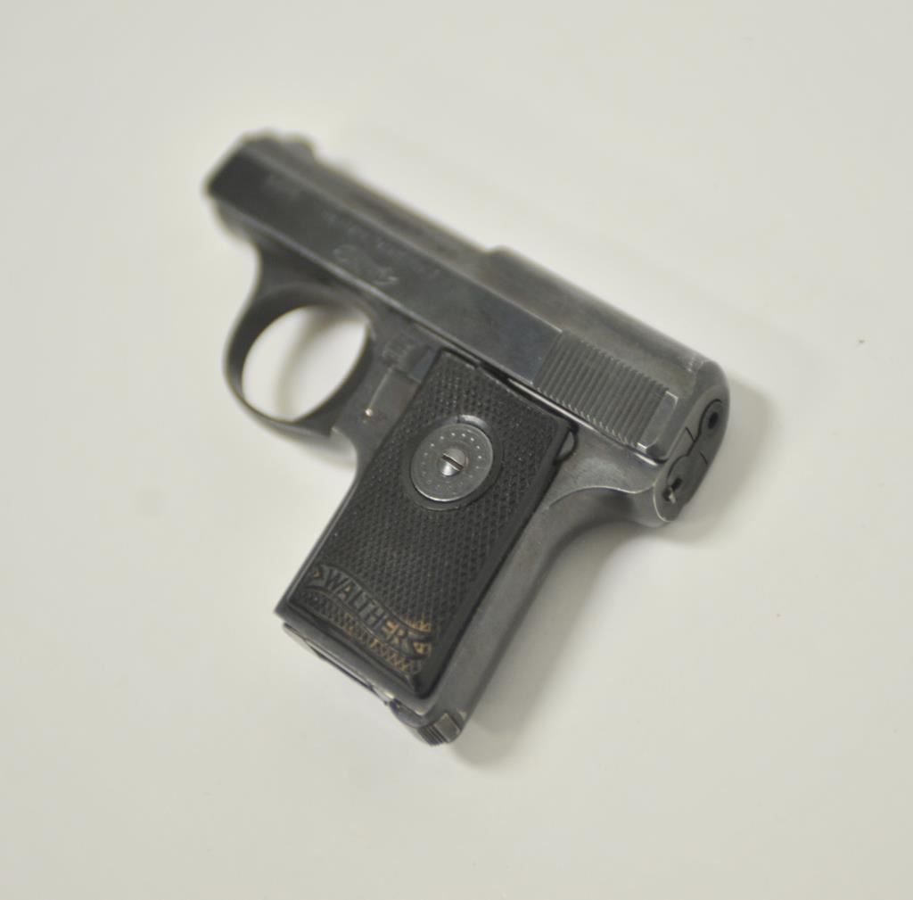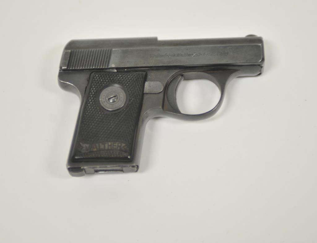 Walther pocket Model 9 semi-automatic pistol, 6.35mm caliber, 2” barrel, blued finish, checkered black hard rubber grips, S/N624859; overall almost fine condition with majority of original finish, very good + bore, crisp action and markings, almost fine grips. (C&R/PPT). Est.: $350-$700.