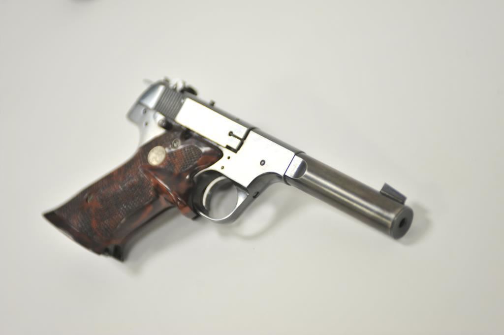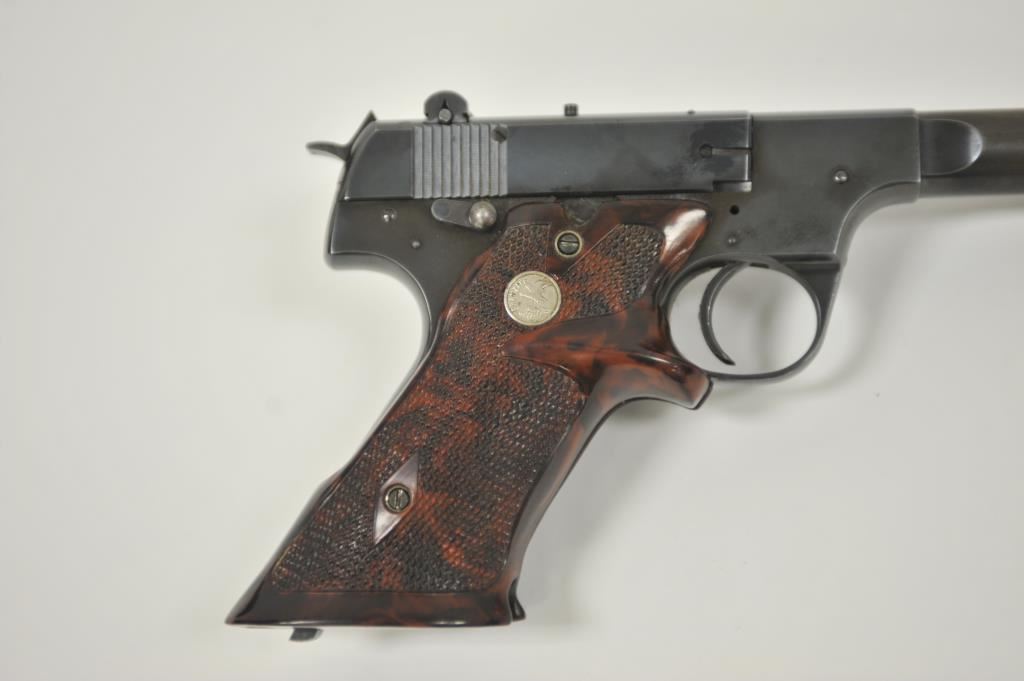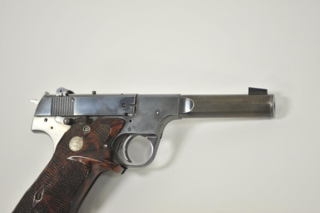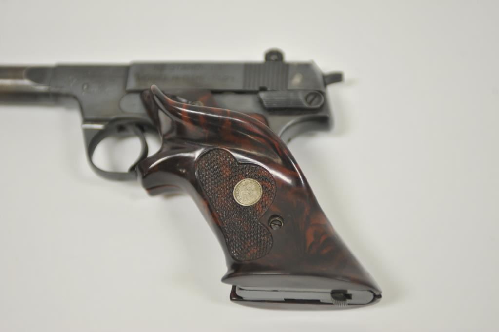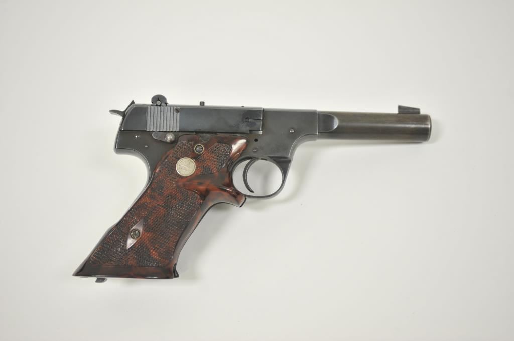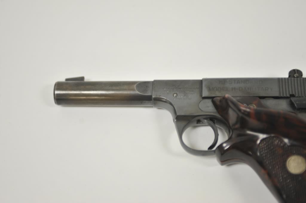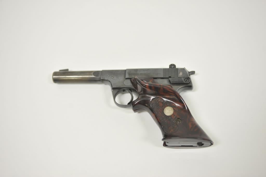 Hi Standard Model H-D Military semi-automatic pistol, .22LR caliber, heavy barrel reduced to 4.5”; blued finish, replaced checkered mottled target thumb rest Franzite medallion grips, S/N 204826; overall very good condition with considerable original blued finish remaining, very good bore, crisp action, sharp markings and good replacement grips. (Modern/PPT). Est.: $175-$350.
