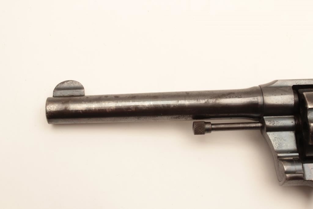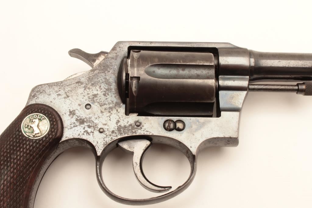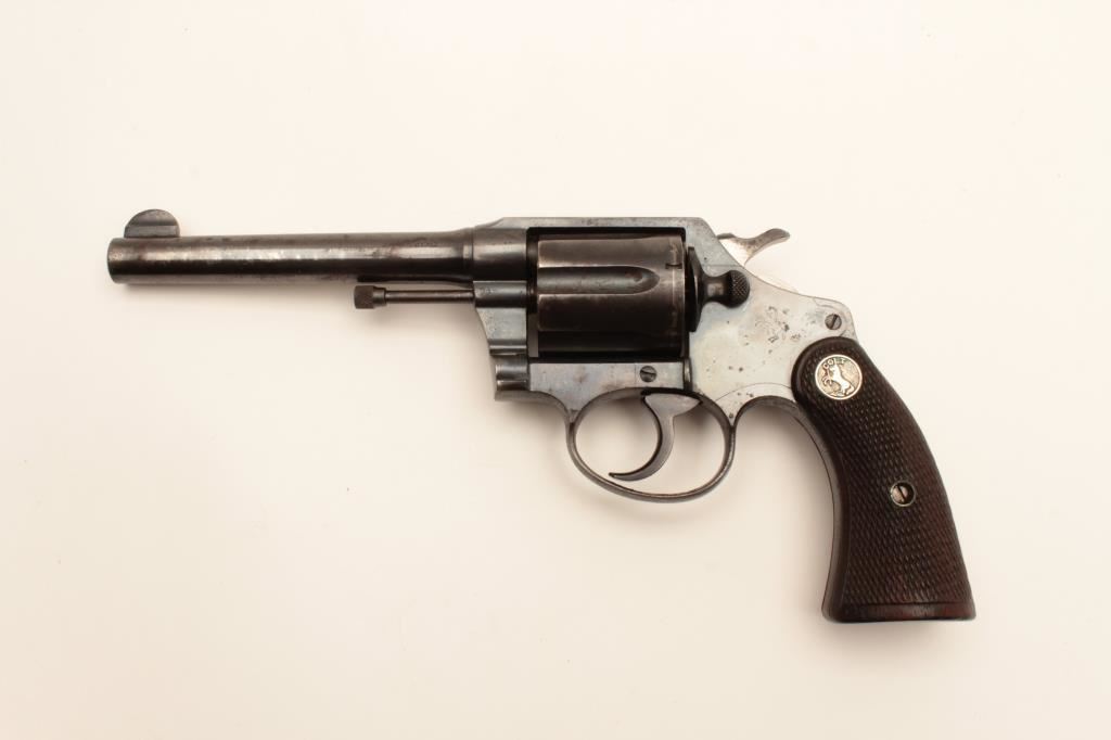 Colt Police Positive DA revolver, .38 Special caliber, 5” barrel, blued finish, checkered wood medallion grips, S/N 318785; overall good to very good condition displaying majority of original finish, some holster and high point wear and some scattered spots of erosion; crisp action, good markings and very good grips. (C&R/PPT). Est.: $250-$500.