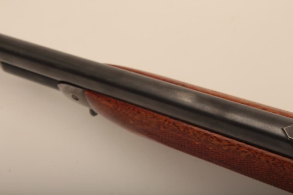 Winchester Model 71 lever action rifle, .348 caliber, 24” round barrel, ½ magazine, blued finish, checkered wood stocks, red hard rubber butt pad added, S/N 1442 (1st year of production); very good + condition overall with majority of original finish remaining, bright area under receiver from carry; very good+ bore, crisp action and markings, very good wood. (C&R/PPT). Est.: $700-$1,400.