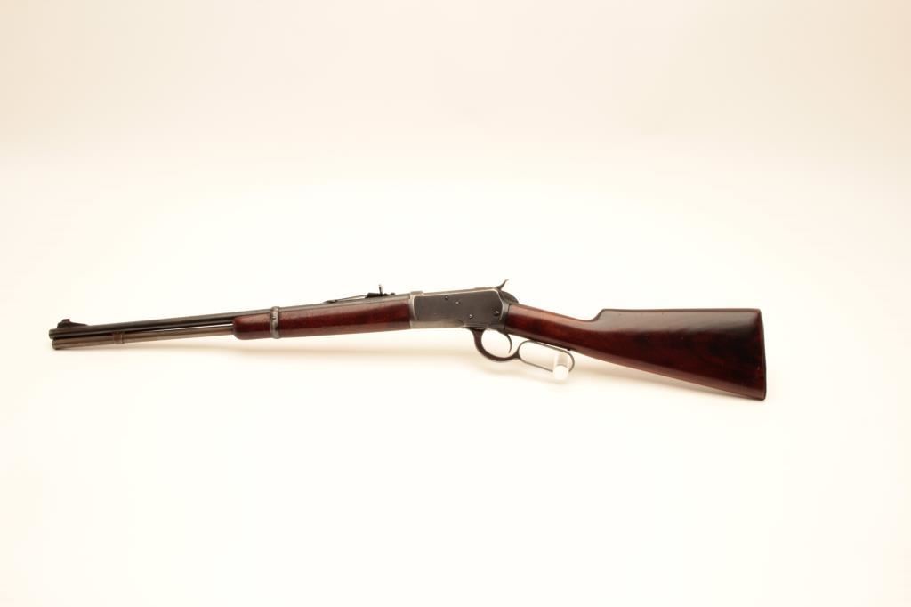 Winchester Model 1892 lever action carbine, .32-20 WCF caliber, Serial #183913. The carbine is in good overall condition with a 20”round barrel with a ramped blade replacement front sight and buckhorn rear sight. The barrel retains the majority of its blue finish while the full-length magazine has toned to grey patina. The receiver retains a significant amount of thinning blue finish. The smooth wood stocks are in good condition with mars and compressions consistent with carry and use. The butt stock ends with a steel butt plate which is slightly proud at the toe. The bore is good, the markings are sharp and the action is crisp on this Model 1892 carbine manufactured in 1901. Est.: $700-$1,400. (C+R).