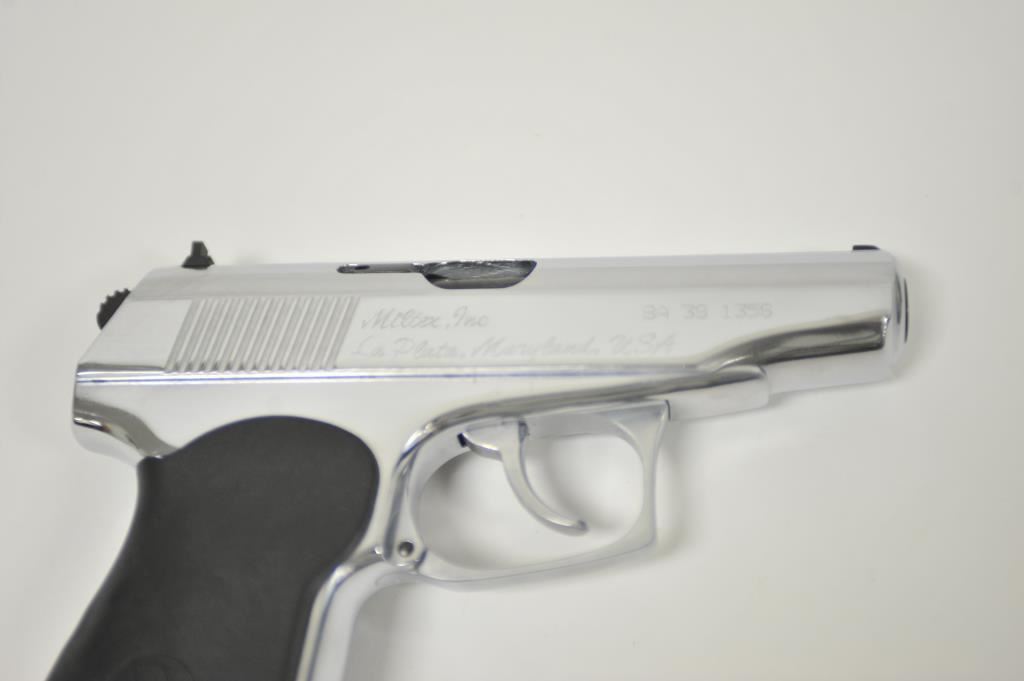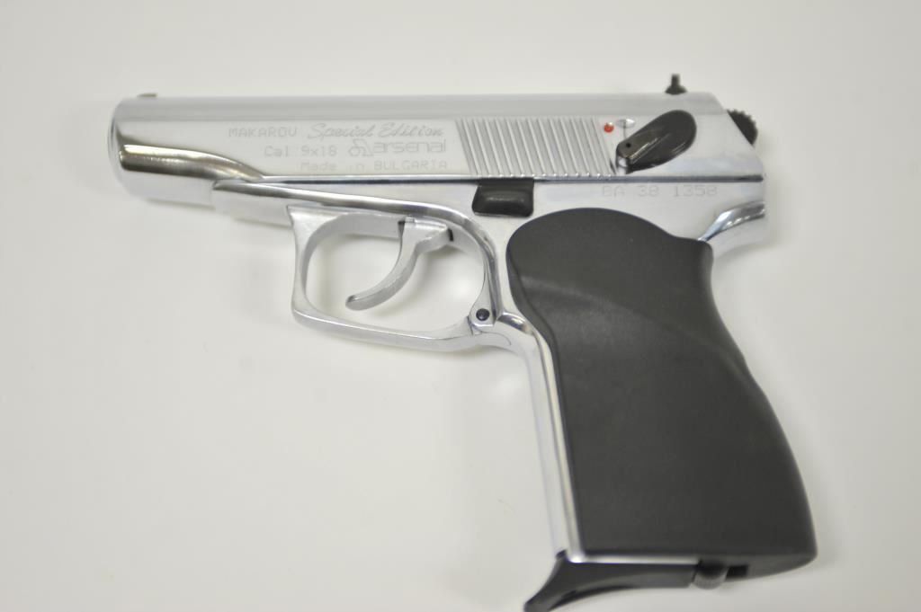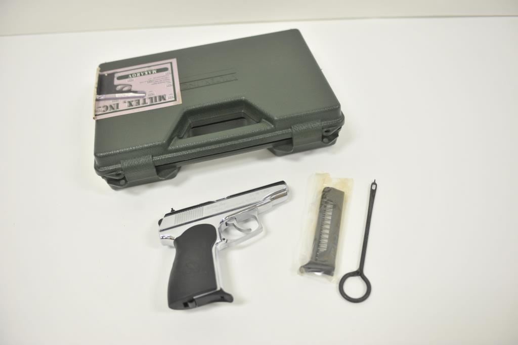 Bulgarian Makarov Special Edition Arsenal semi-automatic pistol marked “Miltex, Inc./La Plata, Maryland, USA” on right side of slide, 9mm caliber, 3.5” barrel, nickel finish, wrap around grips, S/N BA 38 1358; overall fine condition with fine bore, action, markings and grips; accompanied by a hard carry case with one extra magazine and cleaning rod. (Modern/PPT). Est.: $200-$400.