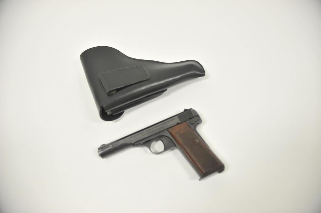 Browning Model 1922 semi-automatic pistol, 7.65mm caliber, 4.5” barrel, blued finish, checkered wood grips, S/N 31775 with nazi marked black flap leather holster and one extra magazine; gun is overall near fine with majority of blued finish remaining, near fine bore, crisp action, sharp markings and very good to near fine grips. (C&R/PPT). Est.: $350-$700.