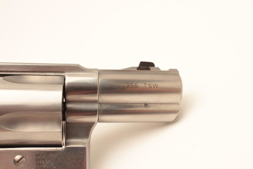 Smith & Wesson Performance Center Model 940 DA hammerless revolver, .356 TSW caliber, 2” ported barrel, stainless, checkered finger groove hard rubber grips, S/N APC0047; like new condition with factory padded Performance Center hard case and detached end label numbered to this gun and inside case. (Modern/NO CAL. SALE). Est.: $500-$1,000.