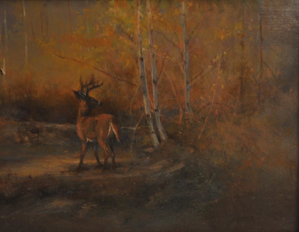 Beautifully framed oil on board of buck deer in woods signed T. Sander (Kalispell, MT.); approximately 16” x 17.5” overall and finely accomplished. Est.: $500-$1,000.